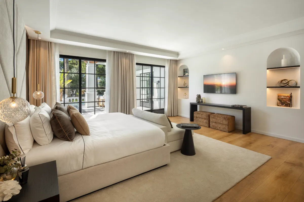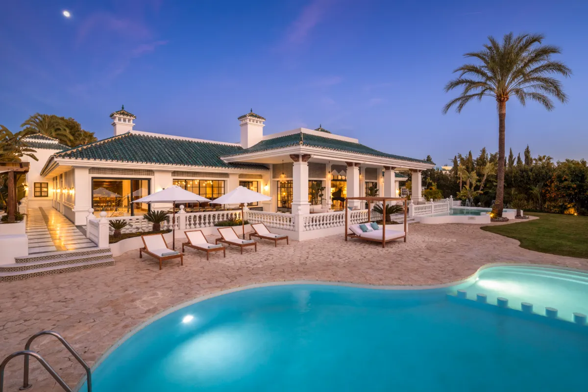 Steeped in Andalusian heritage and architectural grace, Alhambra Palace is a palatial 12-bedroom villa nestled in Nueva Andalucía’s prestigious Golf Valley. Surrounded by lush gardens, a lagoon-style pool, and panoramic views of La Concha, this 1,467 m² residence offers a rare opportunity to own a showpiece estate inspired by the region’s Moorish legacy.