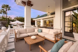 The 12 bedrooms, including a sumptuous ground-floor master suite and multiple en-suite guest rooms, are thoughtfully arranged around the property to balance privacy and flow. Outdoor terraces, shaded pergolas, and lounge corners invite elegant entertaining or peaceful retreat. The upper-level solarium commands sweeping views of Marbella and the mountains — ideal for sunset gatherings.