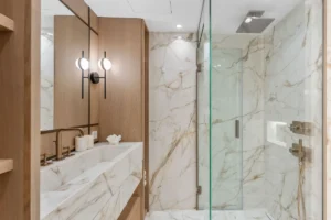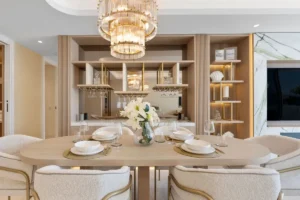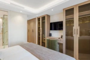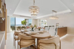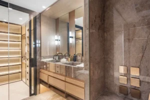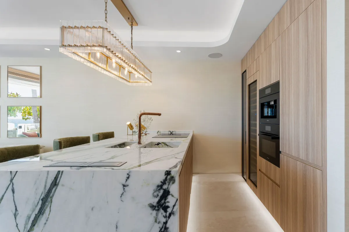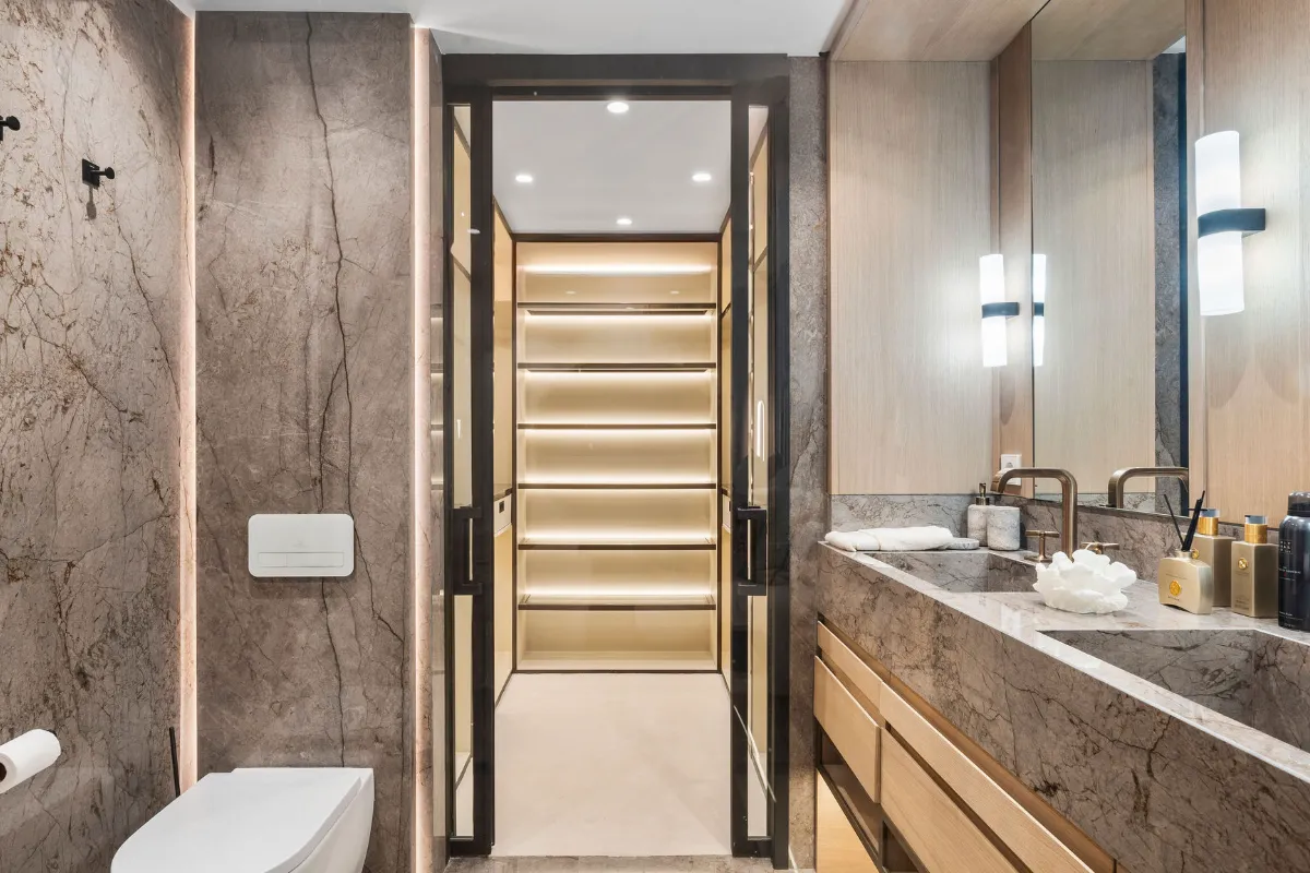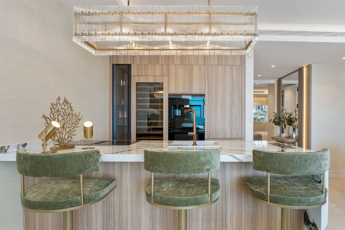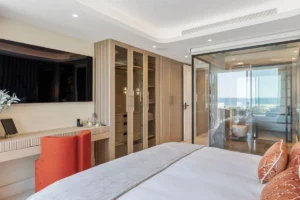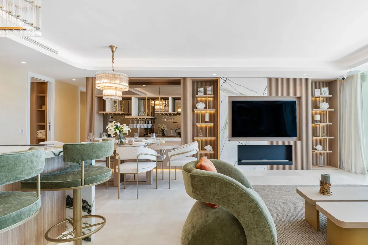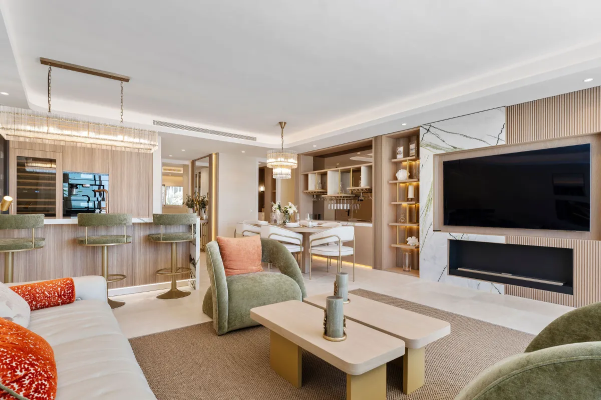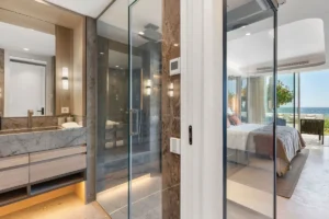 Spanning 179 m² with 42 m² of south-facing terrace space, this three-bedroom ground-floor apartment has been curated with meticulous attention to detail. The open-plan layout flows seamlessly toward the sea, with Technal windows framing calming views of manicured gardens and the Mediterranean horizon. Each of the three bedrooms is en-suite, designed with soft modern lines and high-end finishes, while the bathrooms benefit from underfloor heating for year-round comfort.