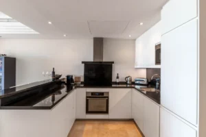The fully equipped kitchen features premium appliances and sleek cabinetry, perfect for casual meals or more formal gatherings. The principal suite is a private sanctuary with an en-suite bathroom, underfloor heating, and walk-in shower, while two additional bedrooms share a second elegant bathroom.