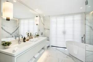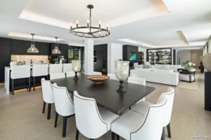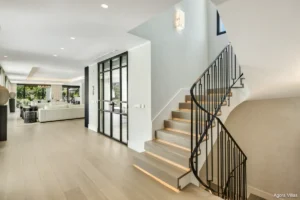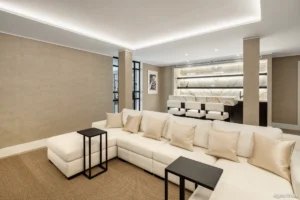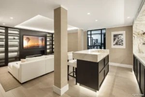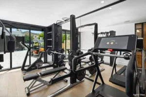 Inside, the villa features five en-suite bedrooms, each designed as a serene retreat. The interiors are defined by sophisticated materials, clean lines, and a sense of understated luxury. The lower level offers a private entertainment floor with a bespoke bar and fully equipped gym — adding lifestyle flexibility to the home.