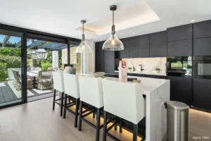 Set on a generous 1,561 m² plot with 490 m² of built space, the villa captures natural light throughout the day, with floor-to-ceiling sliding doors that create a seamless indoor-outdoor connection. The garden is a private haven designed for year-round enjoyment: a large swimming pool, sunken chill-out area, and elegant dining terraces offer an ideal backdrop for entertaining or unwinding in quiet privacy.