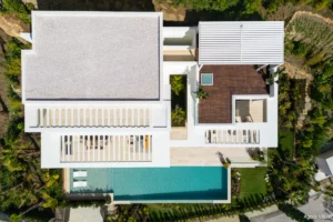 Spanning 716 m² of built space with an additional 335 m² of terraces, the villa’s design centres around light, flow, and elevated comfort. Floor-to-ceiling glass sliders open to expansive terraces and a stunning zero-edge infinity pool, framing panoramic views of the surrounding golf course and sea. Sleek lines, natural materials, and a neutral colour palette create a calm yet sophisticated living environment.