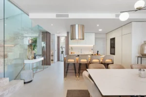 Banus Bay presents an exclusive opportunity to enjoy modern coastal living just 150 metres from the beach in one of Marbella’s most prestigious residential enclaves. Set within the secure, private community of Banus Bay Residences, this four-level townhouse combines architectural elegance with exceptional practicality—offering 265 m² of interior space, 56 m² of terraces, and a private pool with jacuzzi.