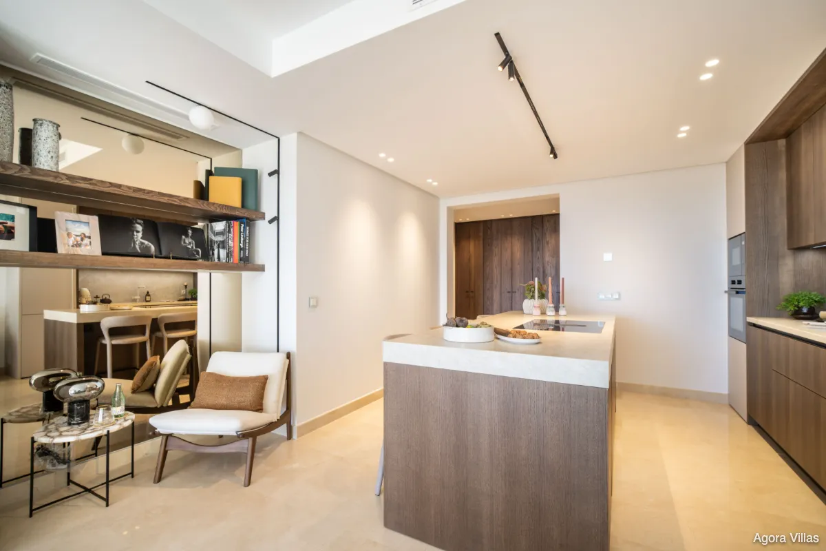 With 124 m² of interior space and 34 m² of terraces, the home is designed for seamless indoor-outdoor living. The open-plan layout is both airy and practical, anchored by a fully equipped kitchen with premium appliances and generous storage. The living area flows directly onto a spacious terrace ideal for alfresco dining, morning sun, or tranquil evenings beneath the sky.