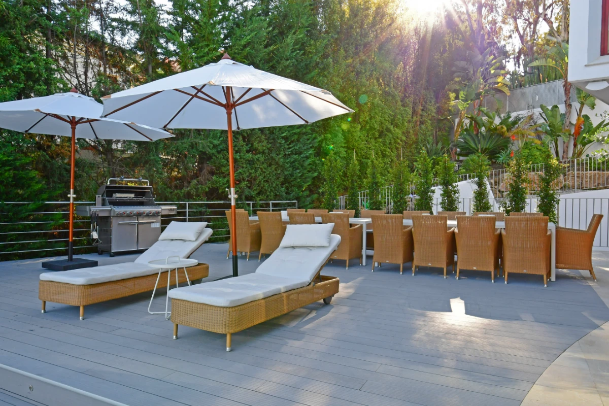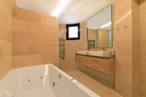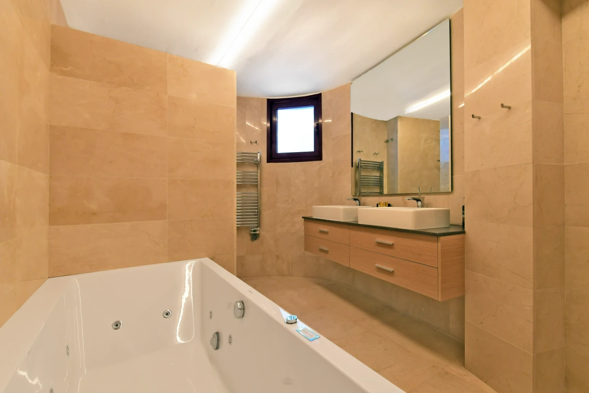 Spanning 667 m² over three levels, the home is thoughtfully laid out for both large family living and high-end rental potential. The villa includes seven spacious bedrooms and six bathrooms, with multiple suites enjoying private terraces and direct access to outdoor areas. The open-plan living room connects effortlessly to the main terrace, where a heated infinity pool, Jacuzzi for five, and a fully equipped barbecue kitchen provide a luxurious outdoor experience.