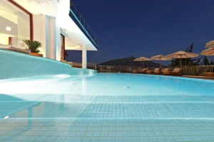 The heart of the home is its designer kitchen, seating 16 guests and featuring dual fridges, a wine cooler, and a hidden scullery with full laundry. An additional rooftop terrace includes an 8-person Jacuzzi with commanding valley and sea views, while a second-floor entertainment lounge with outdoor bar offers another layer of lifestyle space.