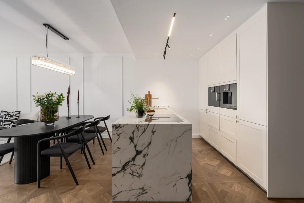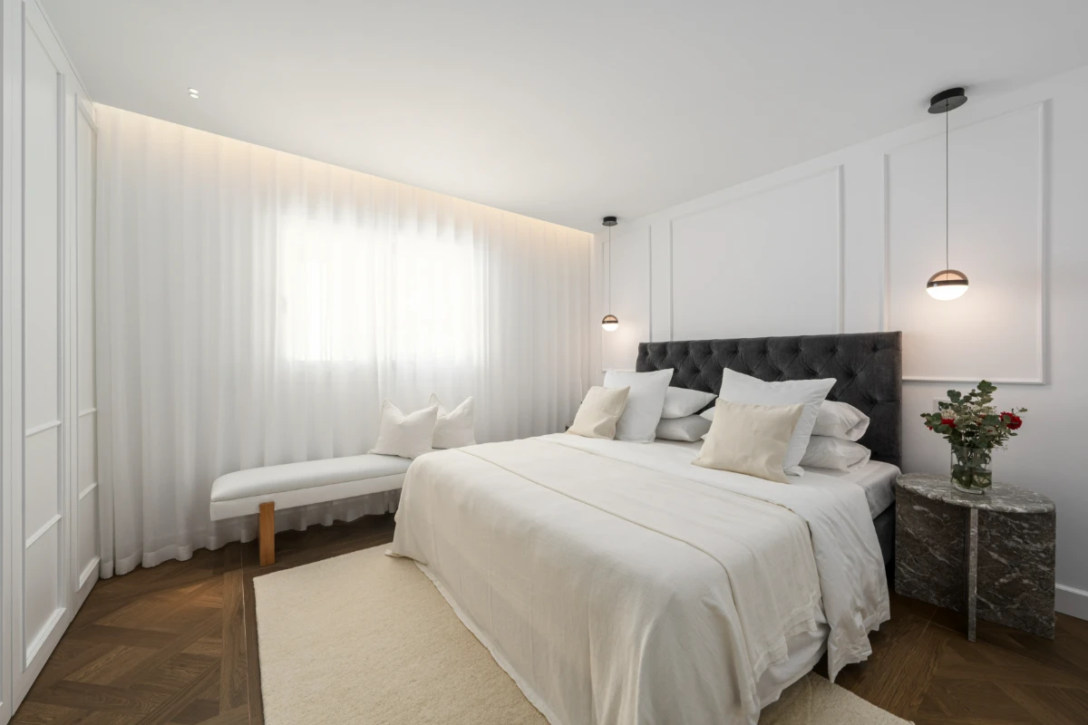 Spanning 144 m² with 118 m² of refined interior space and a 26 m² sun-soaked terrace, the apartment is fully furnished and showcases an exquisite blend of Nordic design and Mediterranean charm. Its open-plan layout features high-end Gaggenau appliances, sophisticated finishes, and timeless materials—offering a turnkey home with seamless indoor-outdoor living.