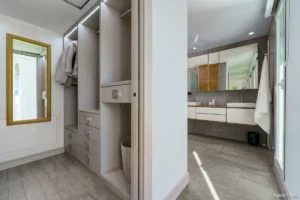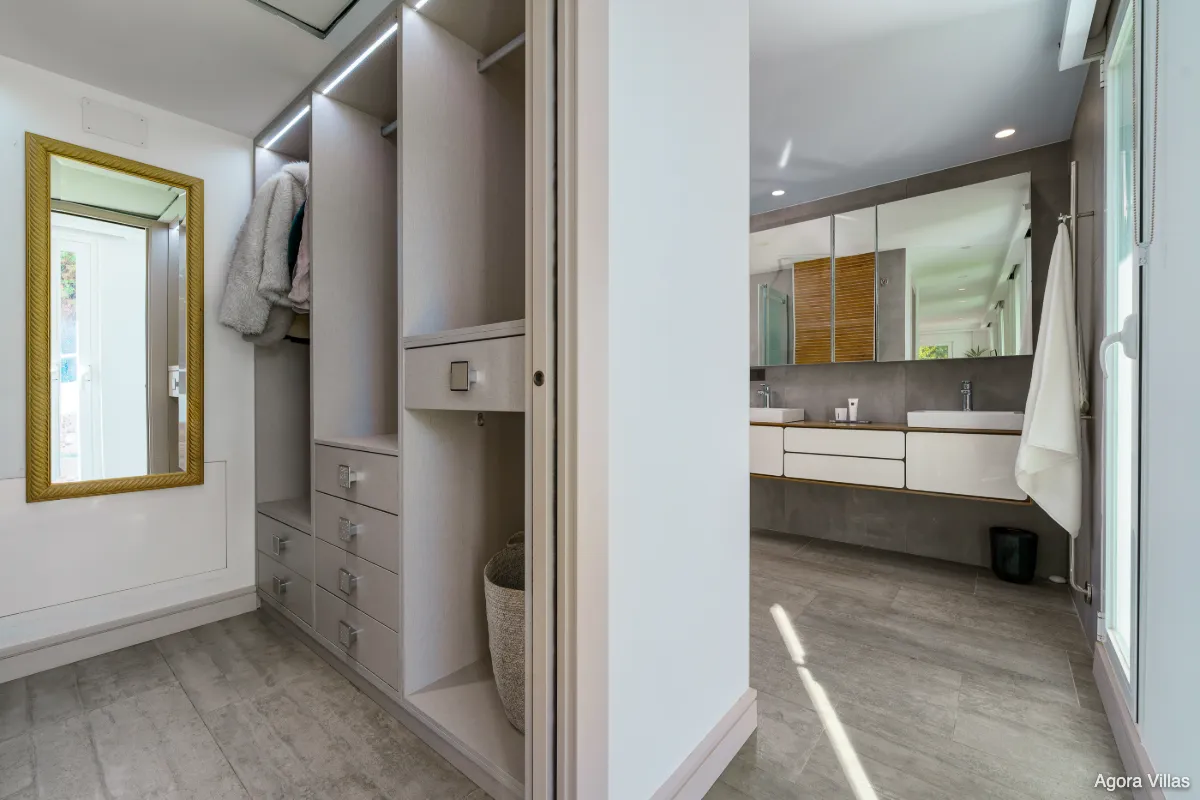 Outdoors, the villa offers a lush, landscaped garden with a heated saltwater pool, jacuzzi, and a discreet outdoor gym. The private guest house—with its own entrance—includes a living room, bedroom, and bathroom, making it ideal for hosting friends or short-term rental income.