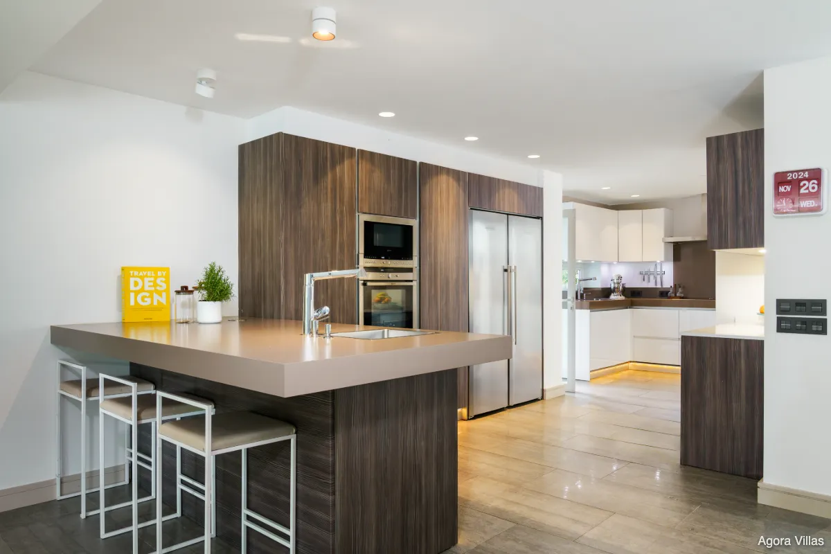 Inside the main residence, the layout is designed for both daily living and entertaining. The open-plan living area flows into a state-of-the-art kitchen and dining space, flooded with natural light. The ground floor includes three en-suite bedrooms and a guest toilet, while the upper floor is reserved for a luxurious master suite with a walk-in wardrobe and spa-style bathroom, along with a guest suite and access to the solarium.