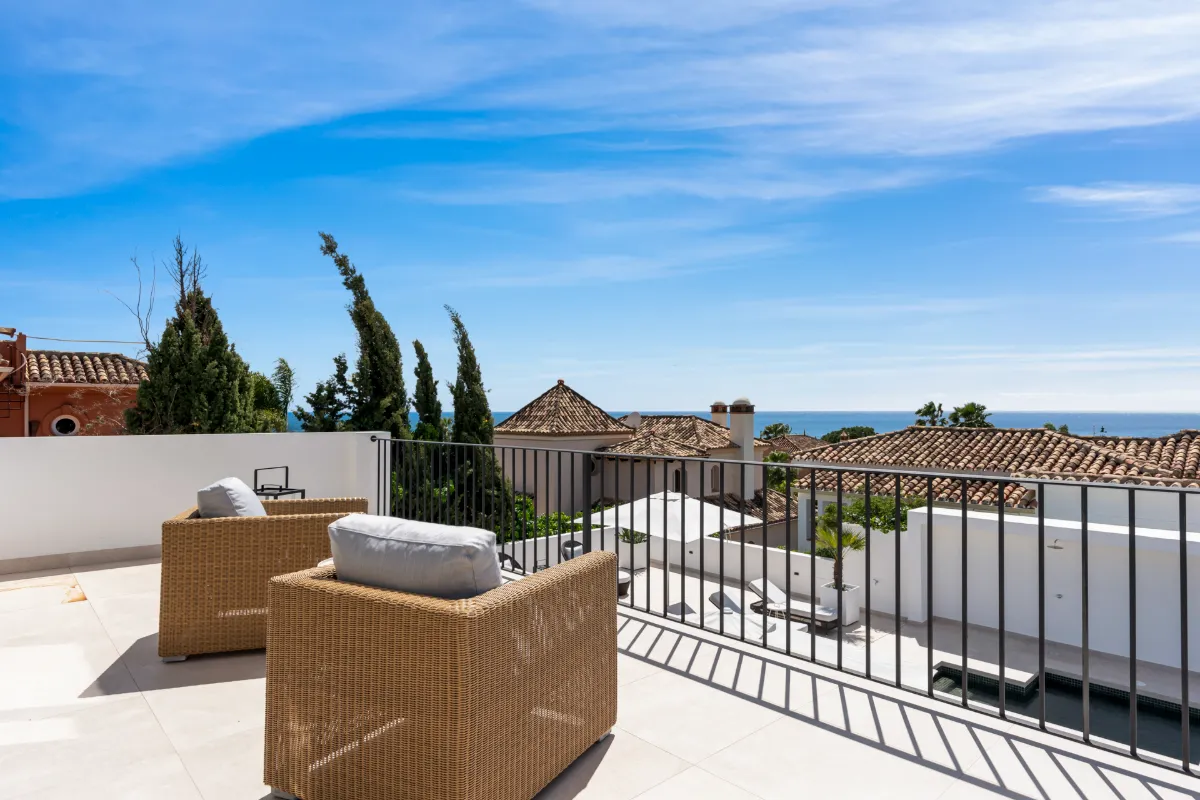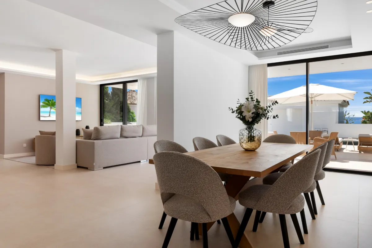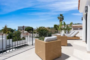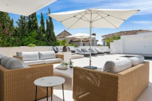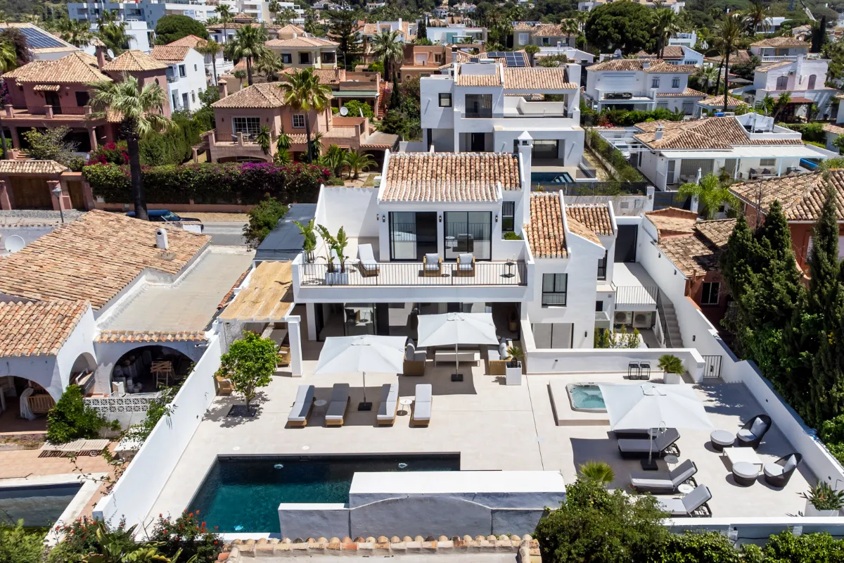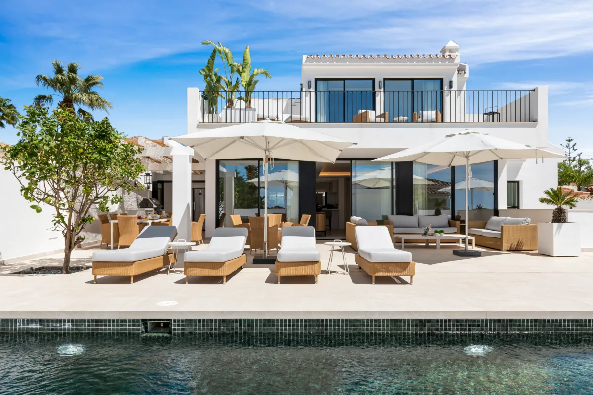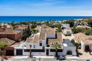 Moments from the golden sands of Las Chapas, Casa Rosario is a beautifully renovated five-bedroom villa in Marbella East offering relaxed coastal elegance and year-round comfort. Blending contemporary design with warm Andalusian charm, this south-facing home is set on a 571 m² plot and enjoys a privileged location just a short stroll from Marbella’s finest beaches and beach clubs.
