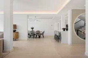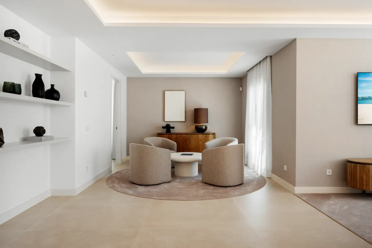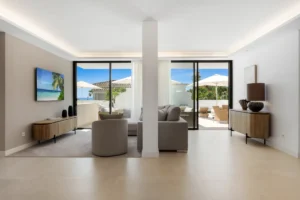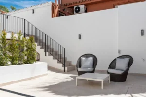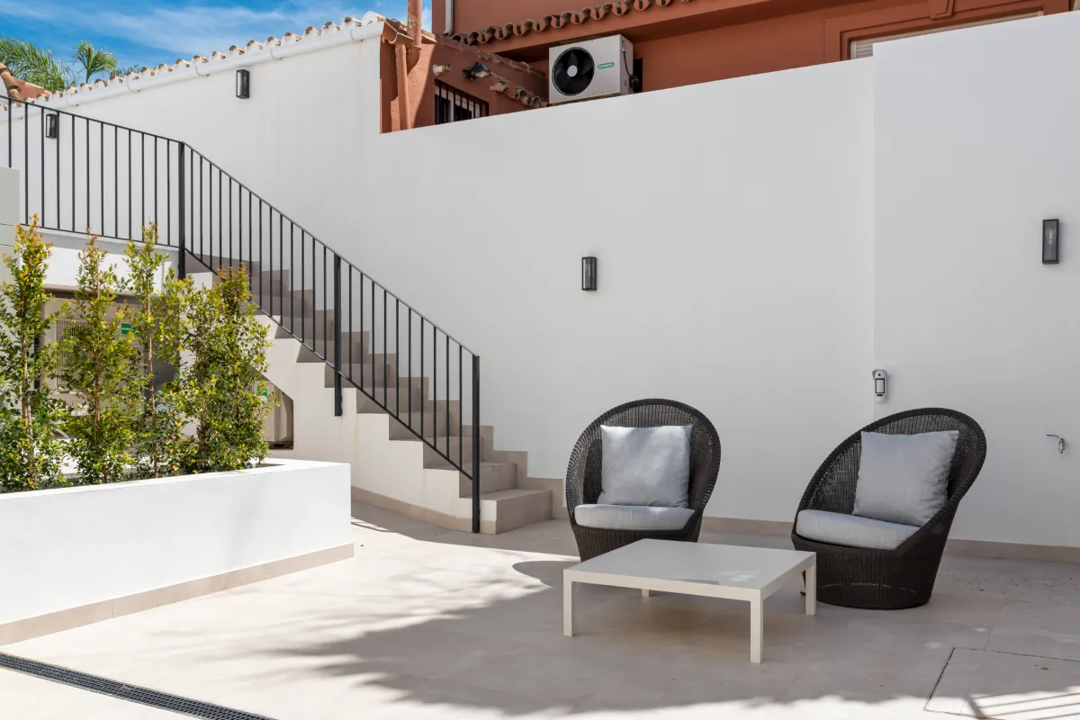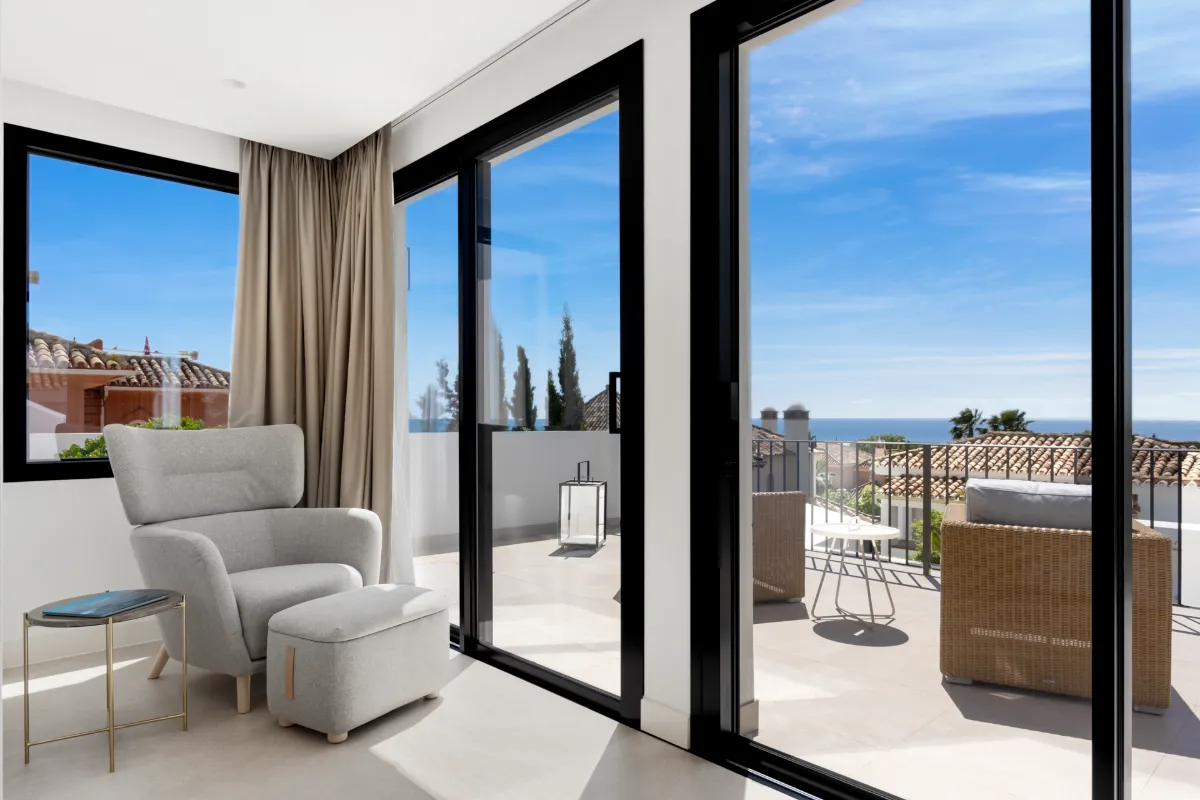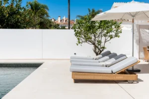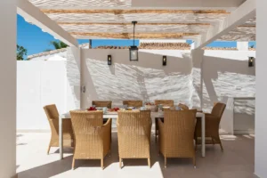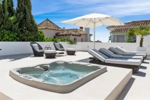 Moments from the golden sands of Las Chapas, Casa Rosario is a beautifully renovated five-bedroom villa in Marbella East offering relaxed coastal elegance and year-round comfort. Blending contemporary design with warm Andalusian charm, this south-facing home is set on a 571 m² plot and enjoys a privileged location just a short stroll from Marbella’s finest beaches and beach clubs.