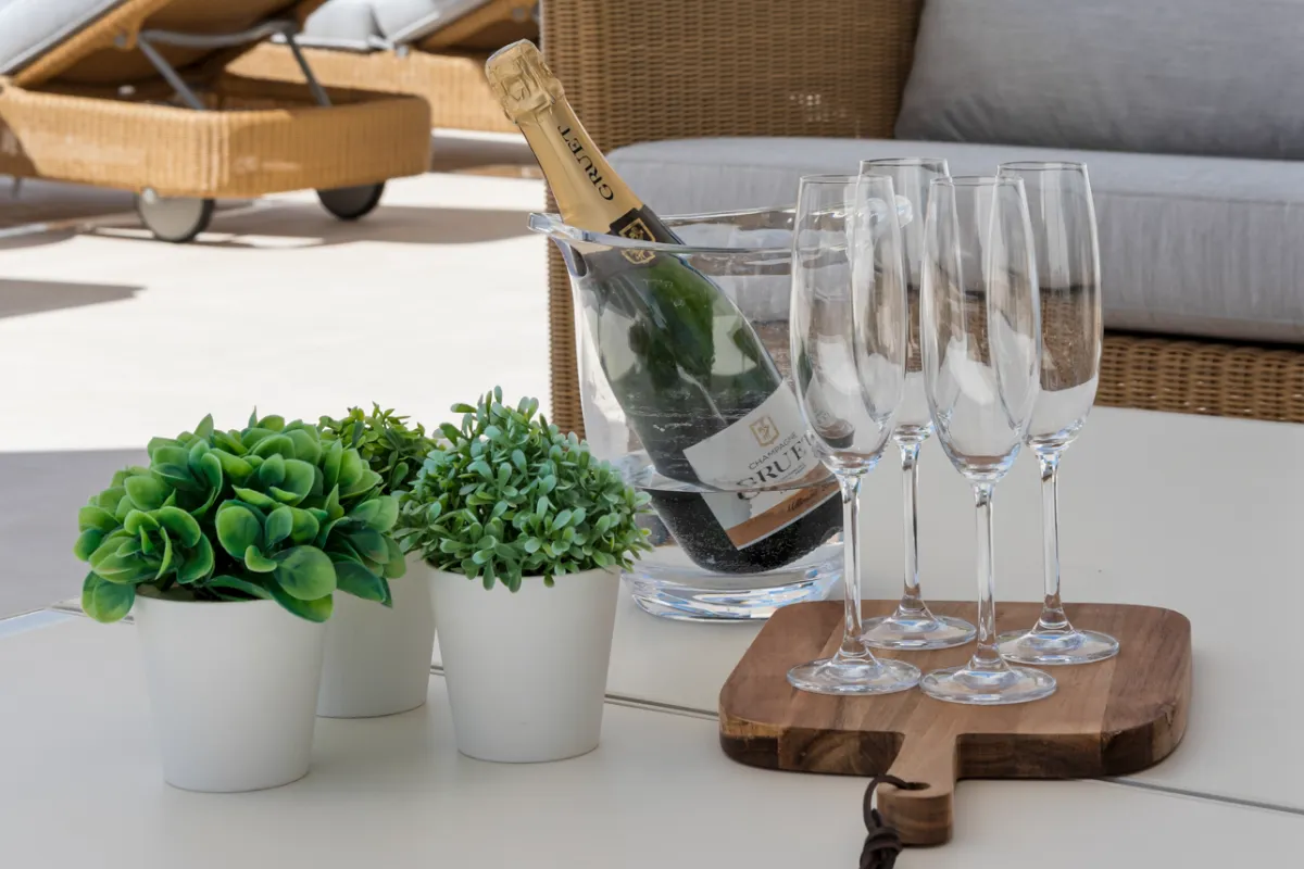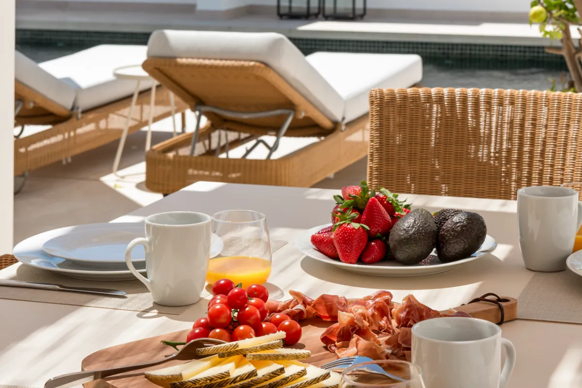 The villa spans 359 m² across three levels and features five en-suite bedrooms, generous indoor-outdoor living, and a host of luxury amenities. The entrance level is open and bright, where the living, dining, and kitchen areas flow seamlessly to a sun-drenched terrace. Floor-to-ceiling glass doors invite natural light and connect the interior to the outdoor retreat — complete with a newly extended heated pool, jacuzzi, rainfall shower, fitted BBQ, and a stylish al fresco dining area.