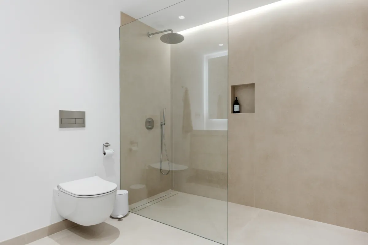 On the lower level, two additional bedrooms open onto another private terrace, joined by a cosy TV room, laundry area, and mini wine cellar — making this level ideal for guests or extended stays. Underfloor heating throughout adds year-round luxury.