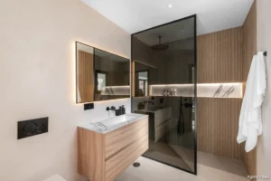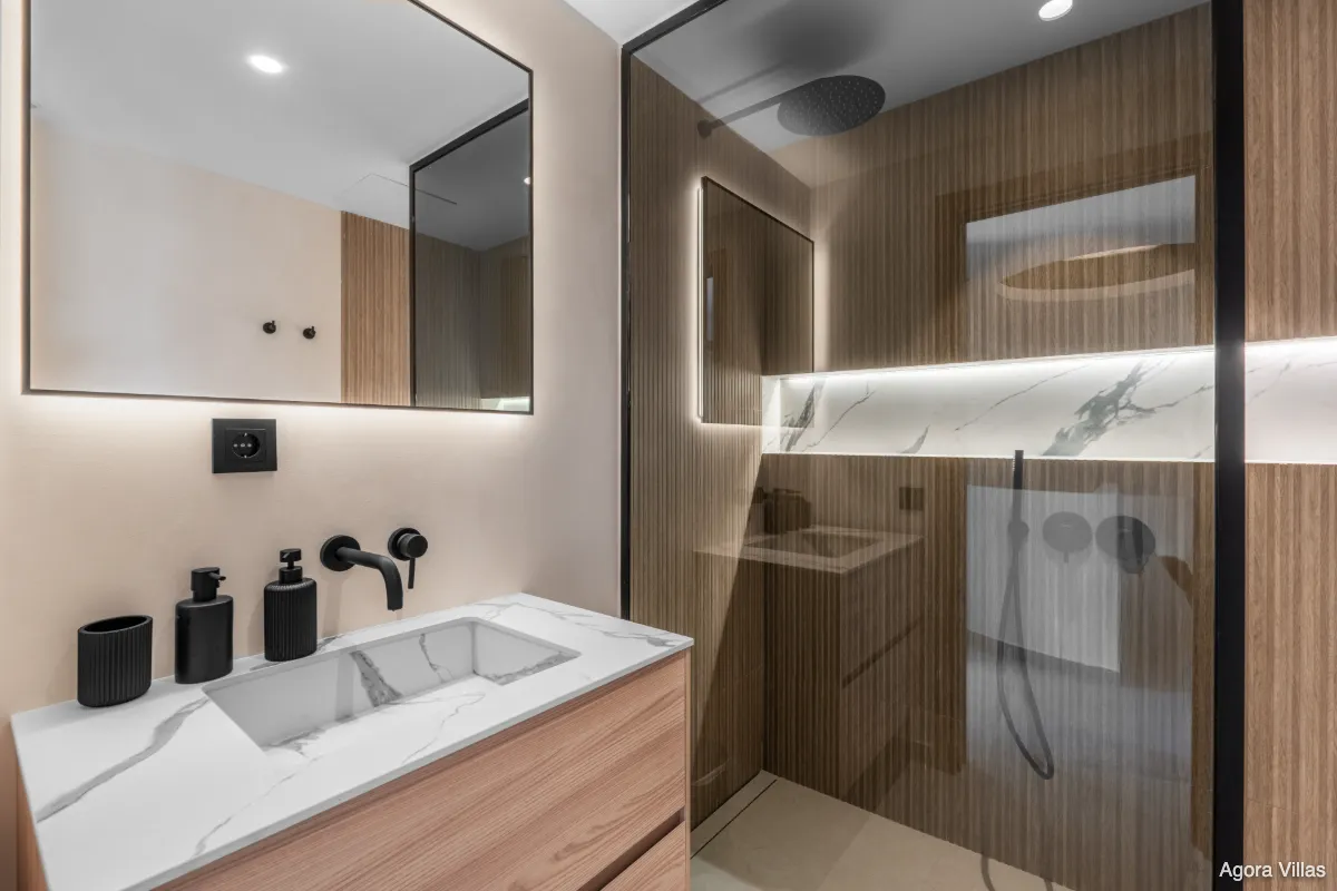Upstairs, three bedrooms provide comfort and privacy. The primary suite includes an en-suite bathroom, a walk-in wardrobe, and access to a private terrace. From here, a staircase leads to the rooftop solarium—an exclusive retreat with panoramic views and endless potential for lounging or entertaining.