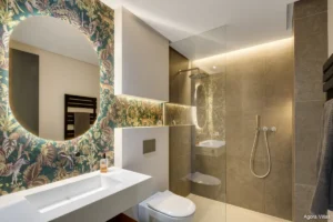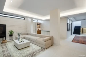 The lower level includes a custom bar and entertainment lounge — a perfect space for hosting, relaxing, or watching a film in style. Carefully curated lighting enhances the home’s evening ambience, while a private driveway, carport, and secure entrance complete the sense of discreet luxury.