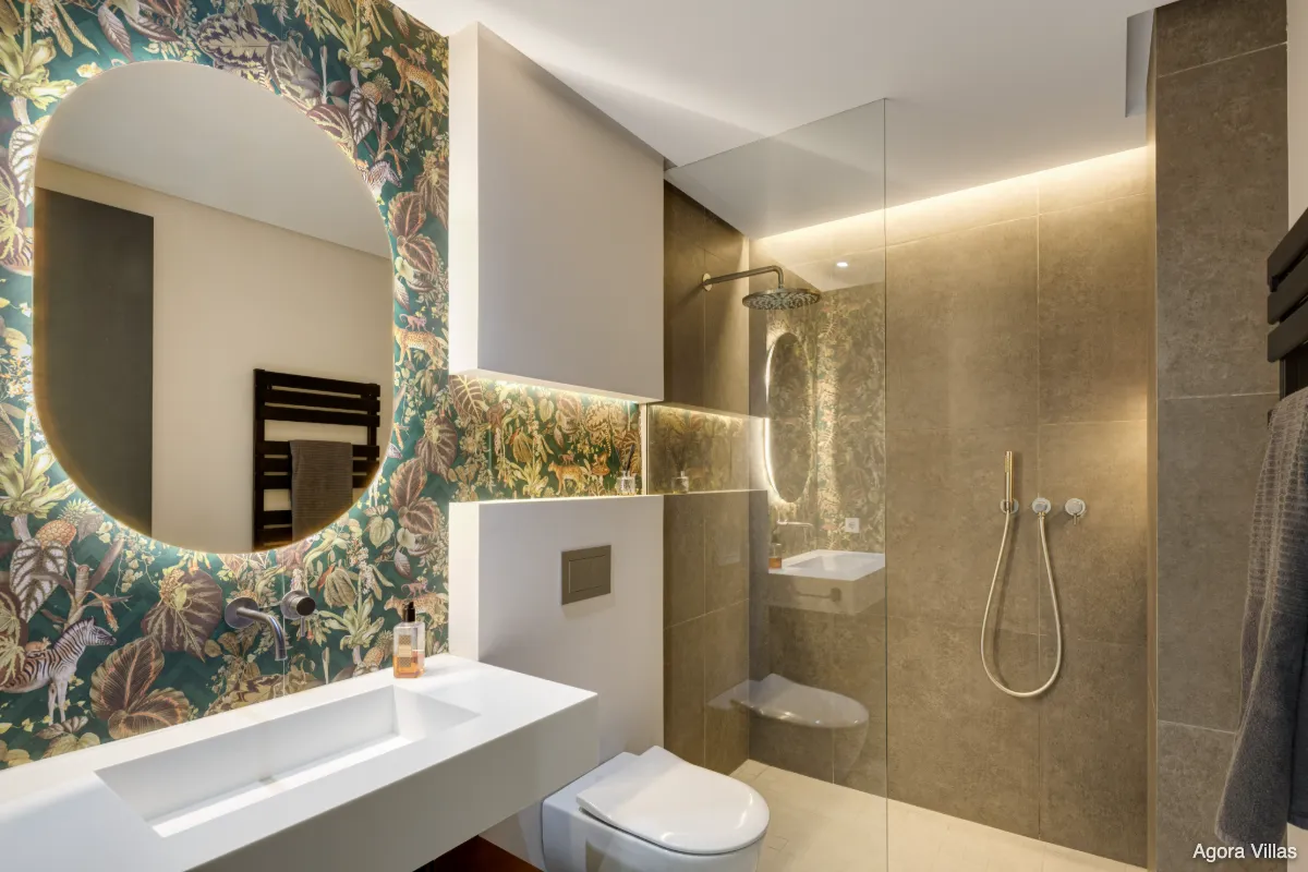 Outside, the property boasts a private pool flanked by a sun deck and a chic pergola, along with a fully equipped outdoor kitchen and BBQ. The terraces offer sun and shade throughout the day, ideal for alfresco dining and evening gatherings. A floating staircase leads to the upper floor, where five spacious bedrooms provide privacy and tranquillity. The master suite features terrace access and a luxurious en-suite bathroom designed with spa-like detail.