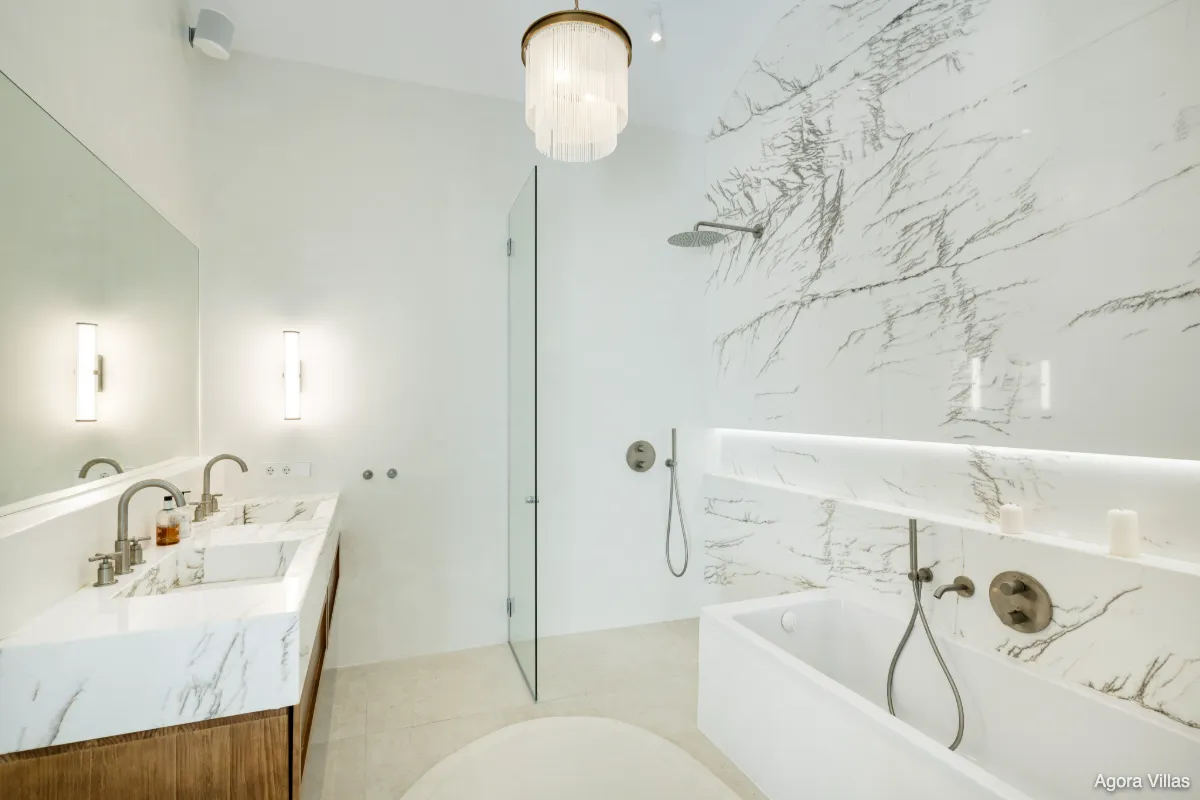 Spanning 231 m² of interior space and 60 m² of terraces, the penthouse is distributed across two levels. The open-plan living area is anchored by a designer kitchen featuring a statement marble island, custom oak cabinetry, high-end appliances, and an integrated wine rack — all framed by floor-to-ceiling glass and natural light.