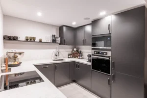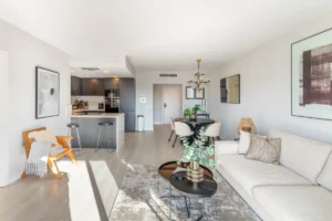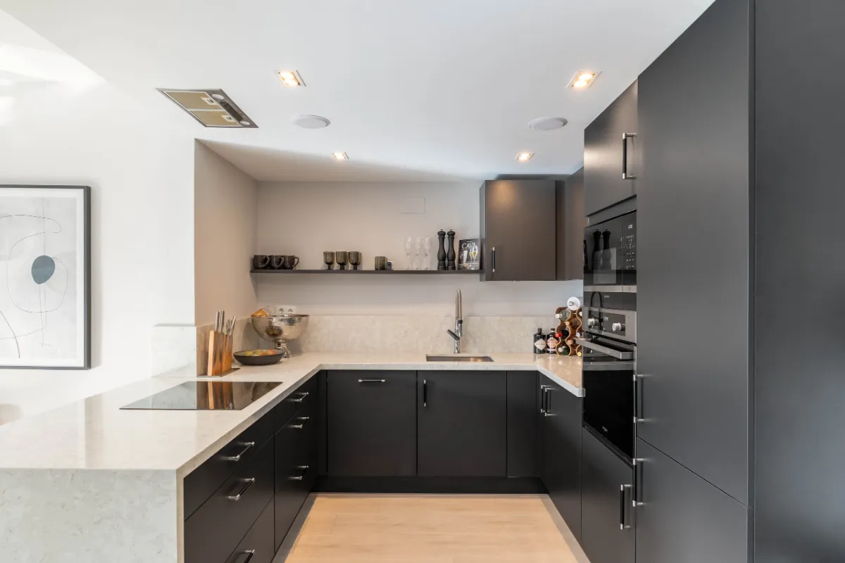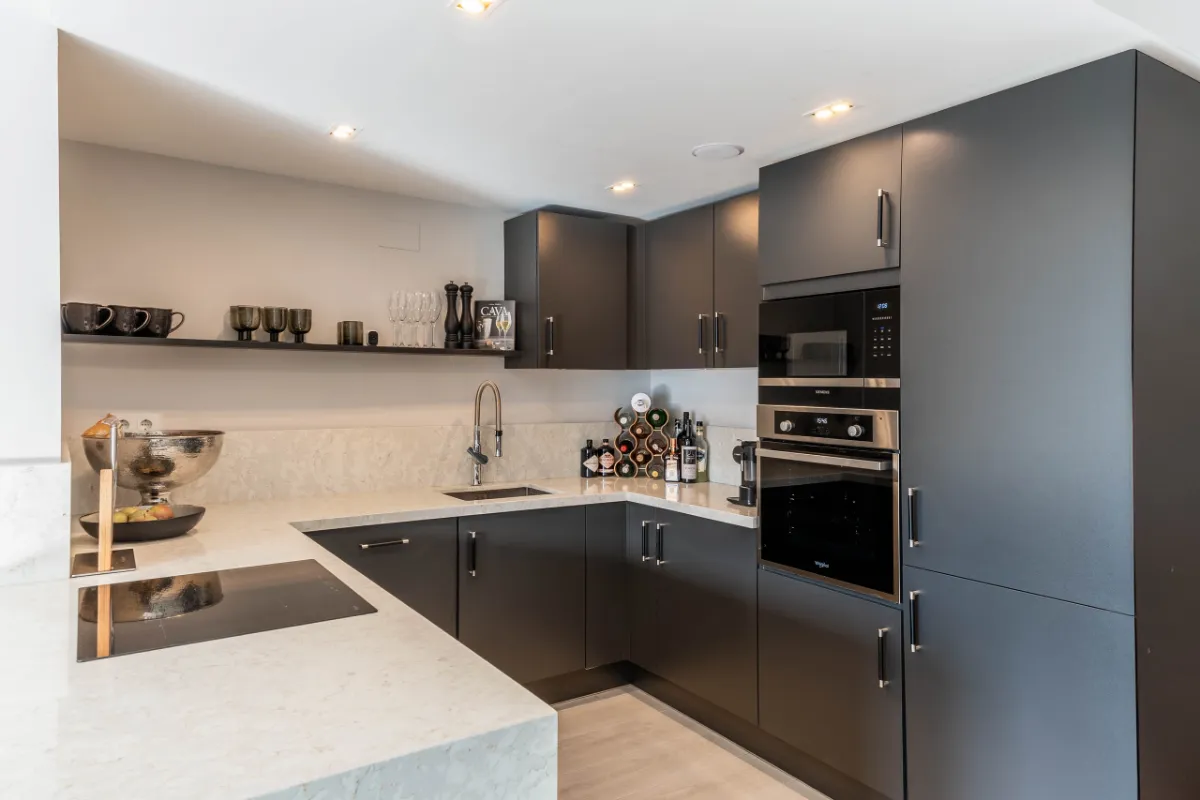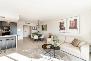 The 139 m² apartment is laid out over a single level and features an open-plan living and dining space bathed in natural light. Floor-to-ceiling glass doors lead out to a generous terrace perfect for relaxed entertaining or quiet morning coffees with partial sea views. The kitchen is a sleek and functional centrepiece, complete with Siemens appliances, a modern breakfast bar, and oak-toned finishes.