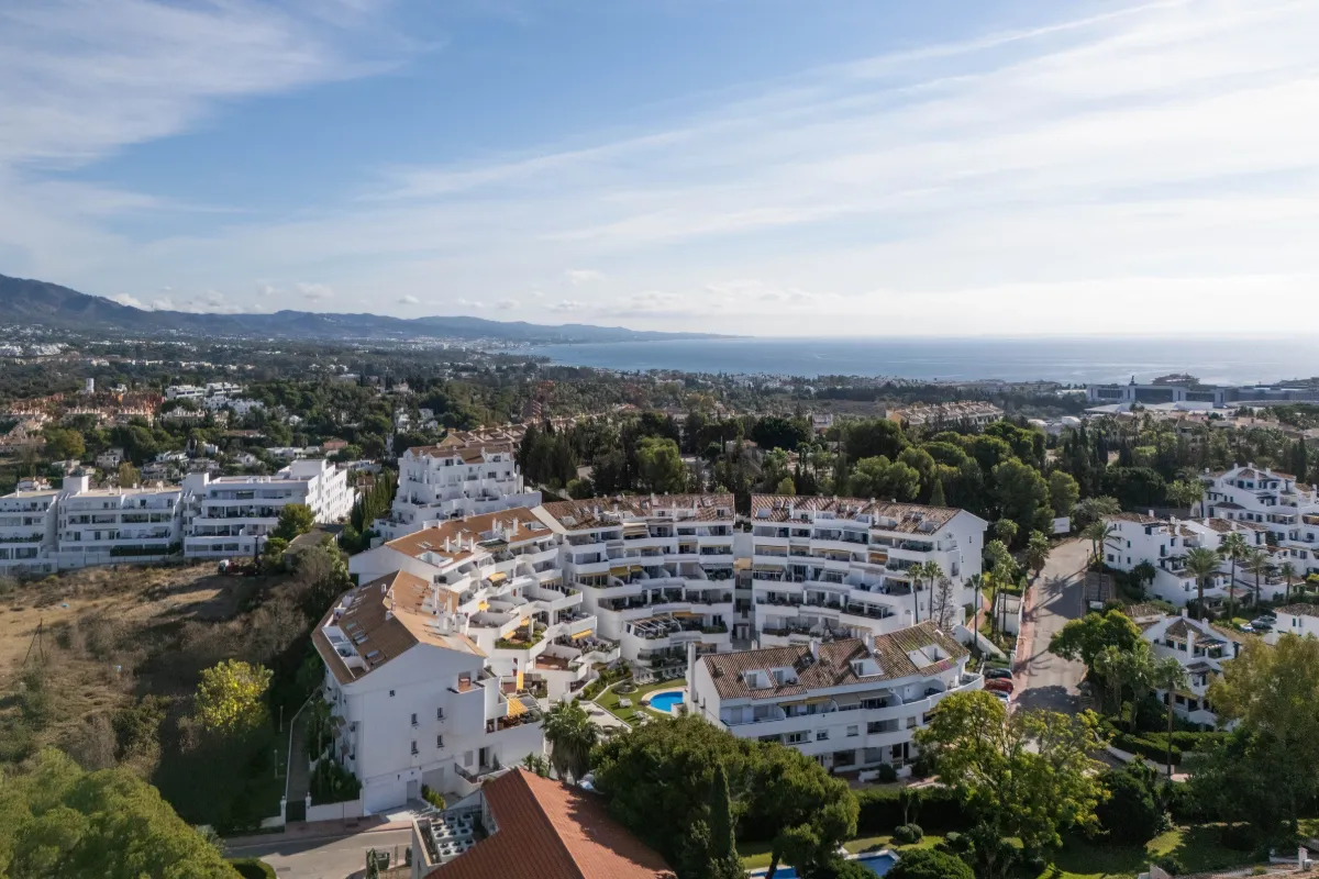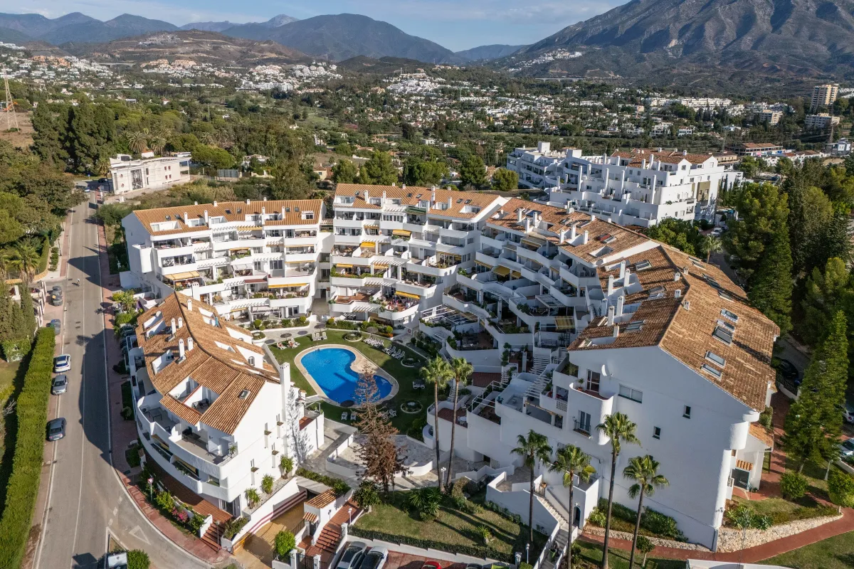 Set within a gated community, residents enjoy access to a large communal swimming pool framed by manicured gardens — a tranquil contrast to the vibrant life of Marbella just outside. With secure underground parking included, the property is just minutes from elite golf clubs (Las Brisas, Aloha, Los Naranjos), top international schools, gourmet dining, and Marbella’s iconic marina.