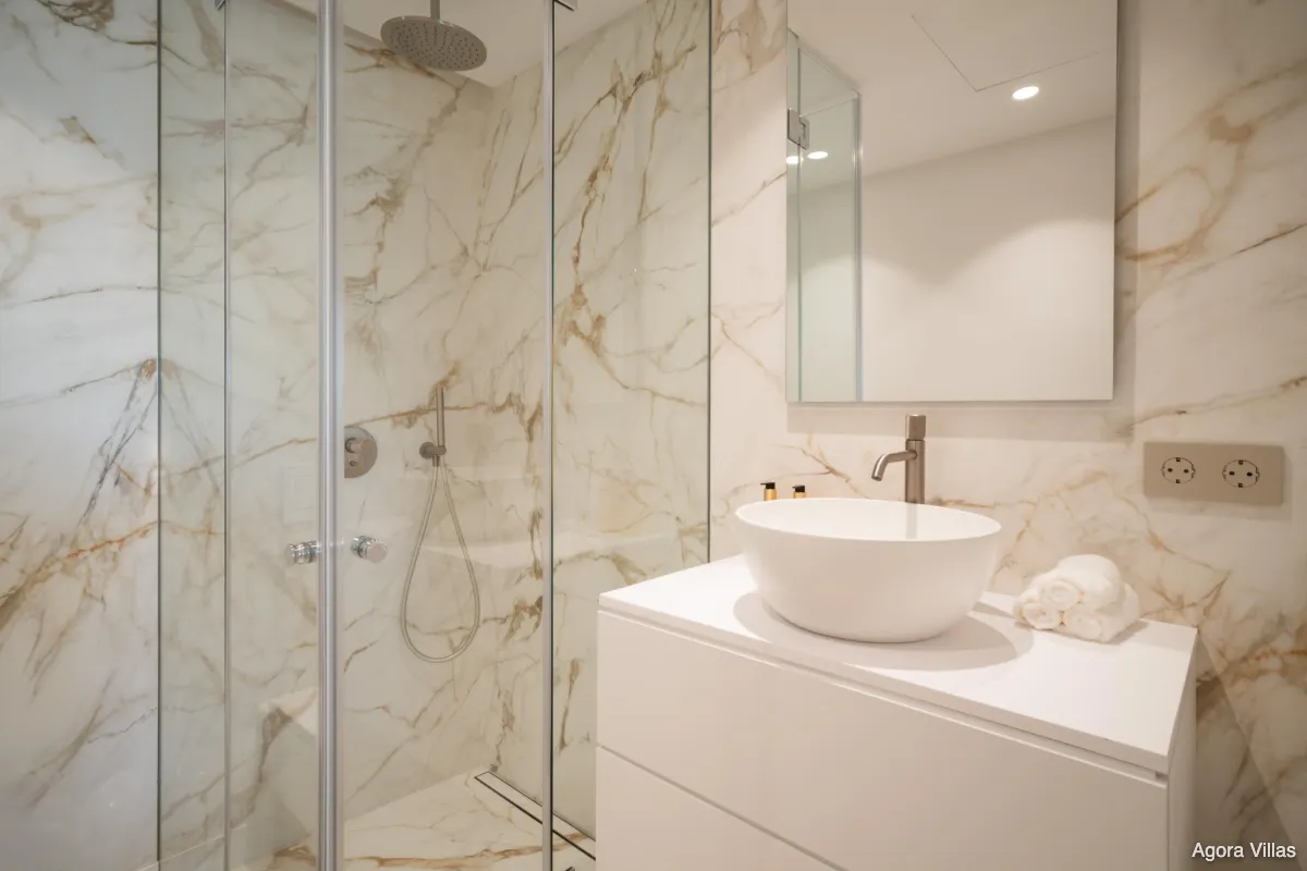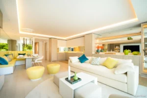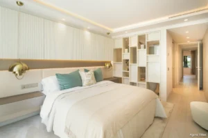 The 136 m² apartment opens to a 41 m² south-facing terrace designed for alfresco dining and laid-back lounging, with direct access from both the living room and master suite. The open-plan interior is flooded with natural light and features integrated LED lighting, soft modern tones, and carefully selected furnishings accented with playful touches of colour. A designated bar area and cosy dining nook enhance the atmosphere, while the fully equipped kitchen provides generous storage and sleek, contemporary finishes.
