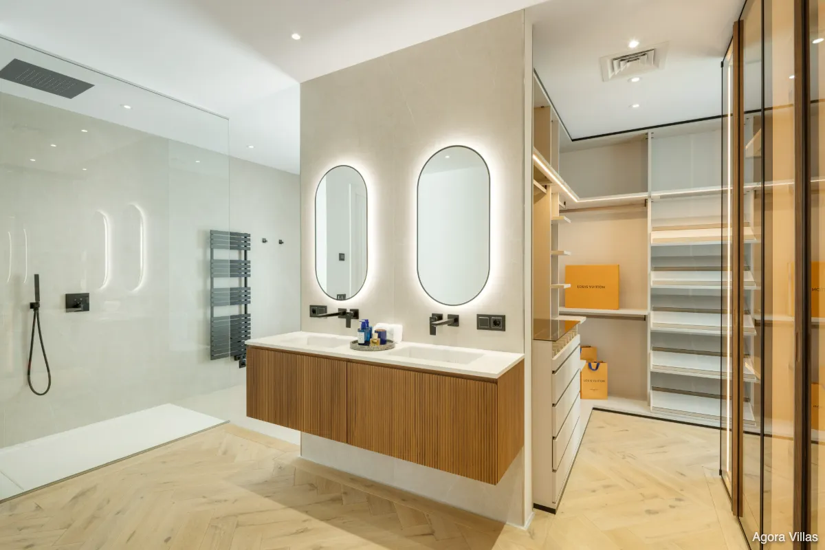 Inside, the open-plan kitchen and dining area feature natural wood accents, bespoke cabinetry, and high-end appliances. Two distinct living areas — one intimate and the other ideal for social gatherings — are styled with curated furnishings and a warm, understated palette. The five bedrooms offer generous proportions, while the primary suite is a standout retreat with a spacious walk-in wardrobe, spa-like en-suite with a freestanding tub, and direct access to a private courtyard.