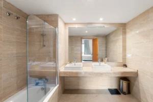 Both bedrooms are generously sized with built-in wardrobes and elegant finishes, while two bathrooms complement the property’s move-in-ready appeal. High-quality materials and finishes are matched with thoughtful details such as integrated air conditioning for year-round comfort.