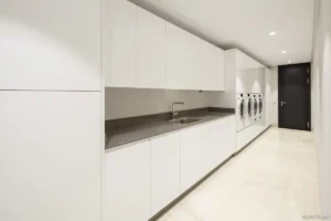 The main kitchen, with its floating dining island and integrated table, is both a culinary workspace and a design centrepiece. The interiors are defined by neutral palettes, ambient lighting, and warm textures that elevate the home’s atmosphere. Each of the seven en-suite bedrooms has been designed for privacy and comfort, while the master suite includes a marble-clad bathroom, walk-in wardrobe with a jewellery and accessories area, and direct access to the upper terrace with sweeping views.