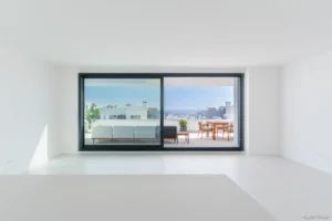 Spanning 113 m² of interior living and an expansive 159 m² of terraces, the home is defined by its open-plan layout, floor-to-ceiling windows, and contemporary finishes. The living room flows into a sleek, fully fitted kitchen, while all bedrooms are generously sized, with the master suite featuring an en-suite bath and direct access to the terrace. A guest toilet adds to the practical, well-balanced layout.
