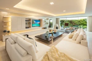 Spanning 921 m² across three levels, the home opens with an impressive double-height entrance that sets the tone for its expansive interiors. The open-plan layout connects an elegant living room, dining area, and a fully equipped designer kitchen—all facing the tropical garden and the shimmering infinity pool. Sheltered and open terraces extend the living space outdoors, creating a series of lounge and dining areas ideal for entertaining under the sun or stars.