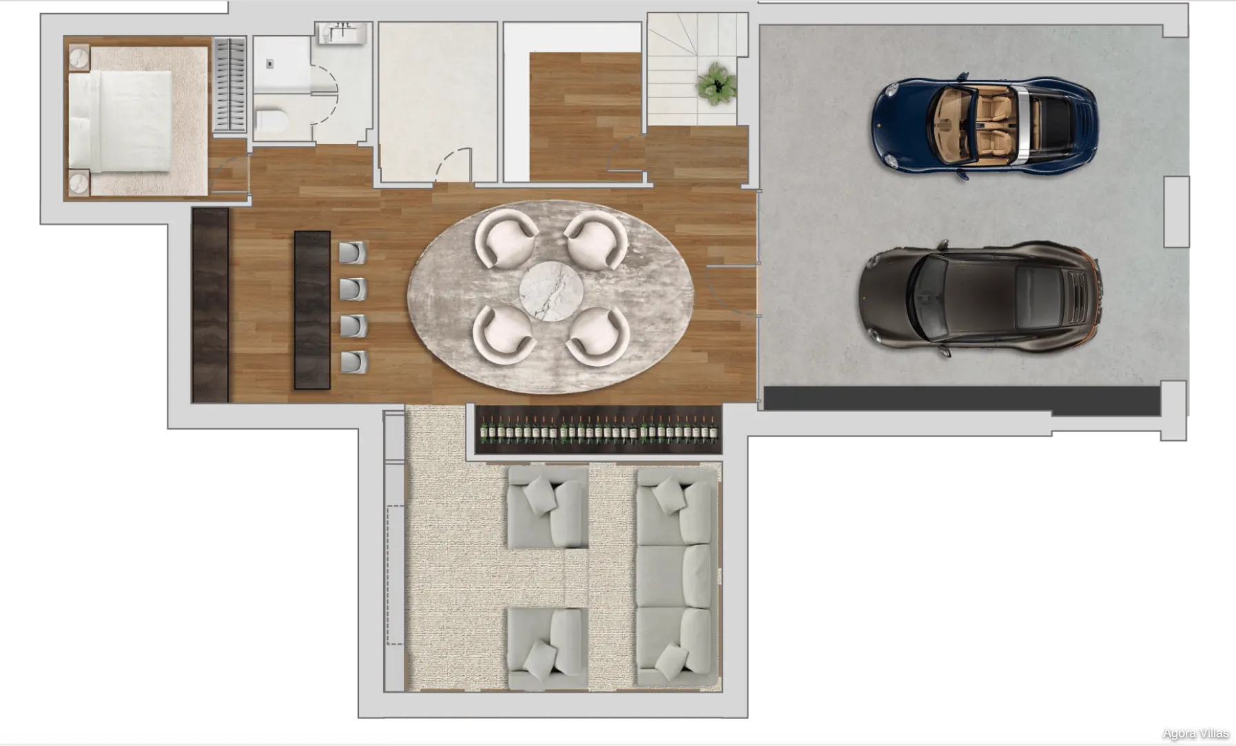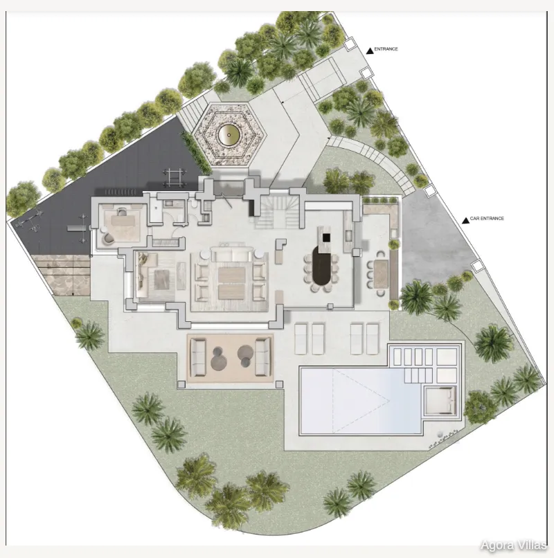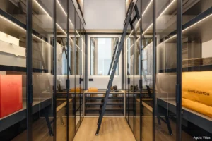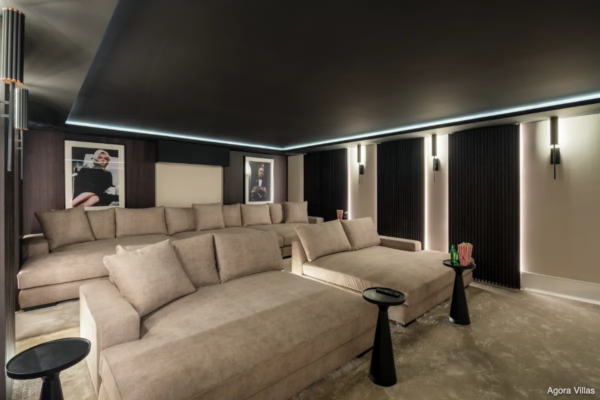 Five en-suite bedrooms include a standout master suite with a private terrace, walk-in closet, and spa-style bathroom. The lower level features a fully equipped bar, a glass wine cellar, a private cinema, and a lounge space that merges design with function. Car lovers will appreciate the garage’s feature wall—turning vehicles into a visual element of the home.