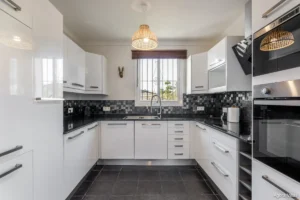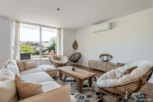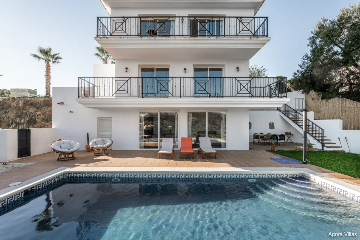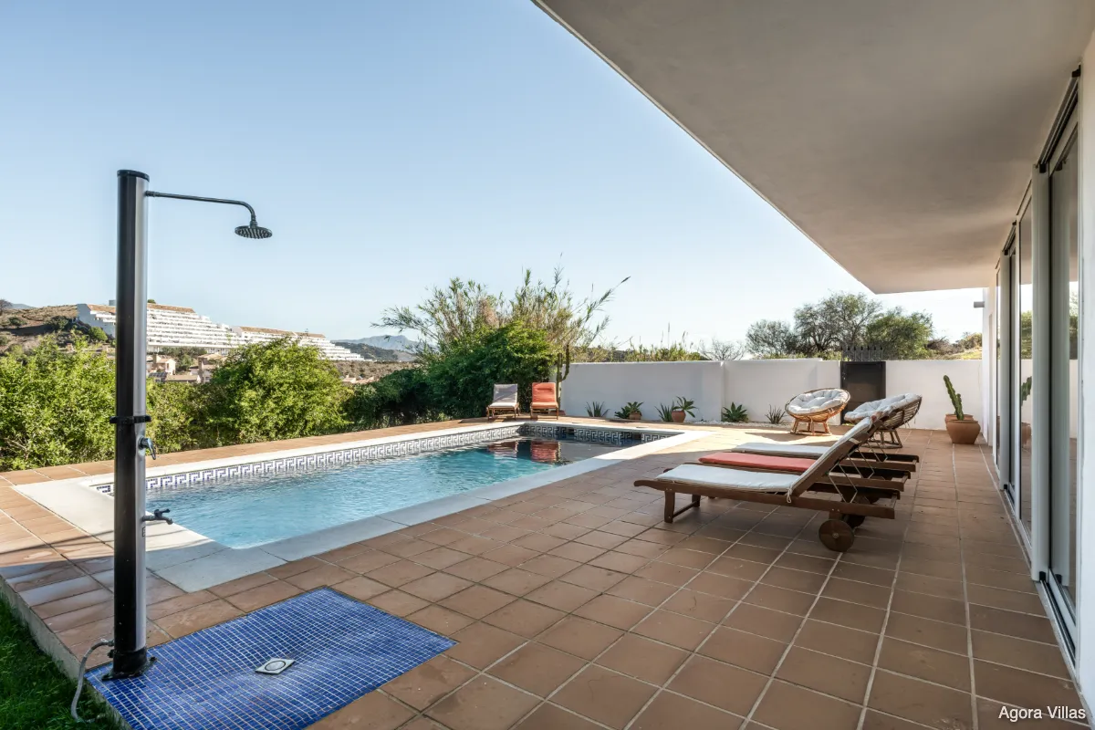 Outdoors, the villa offers a fully private pool with outdoor shower, lounging space, and landscaped garden areas. The north-east orientation ensures soft light and cooler temperatures in summer — ideal for Estepona’s year-round climate. With its elevated position and quick access to town, Villa Jazu combines seclusion with convenience.