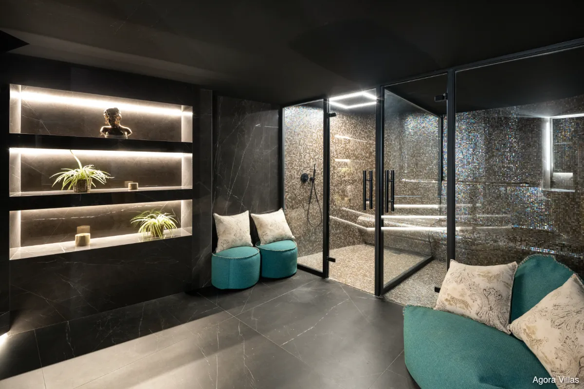 Inside, the villa offers five en-suite bedrooms and eight bathrooms in total, including two guest toilets. The main floor features expansive open-plan living and dining areas that extend onto generous terraces—ideal for elegant hosting or serene daily living. Lifestyle features include a custom-built wine cellar, private cinema, and sculpted garden with an infinity-edge pool that reflects the sea beyond.
