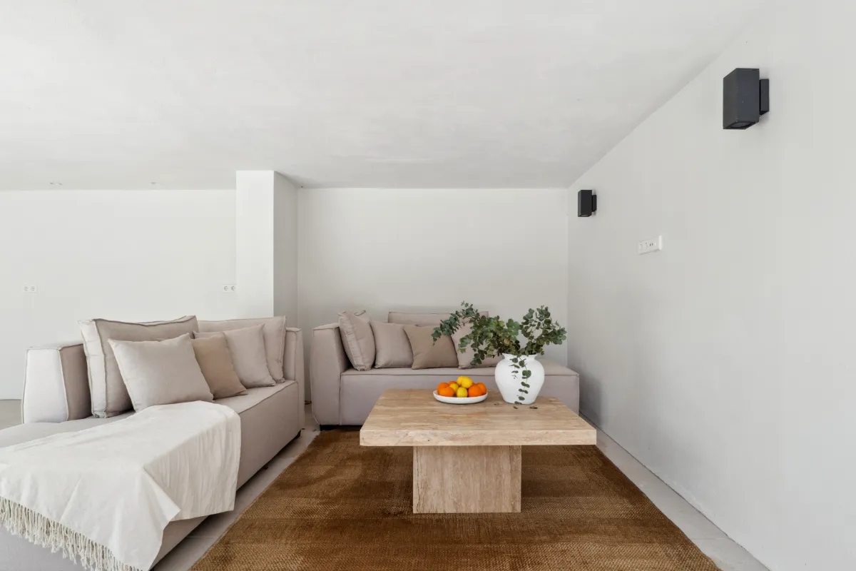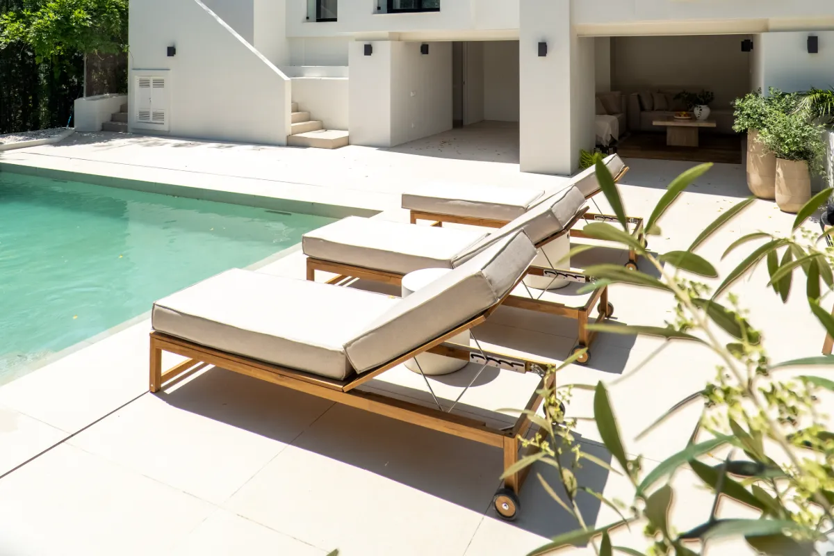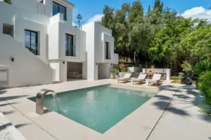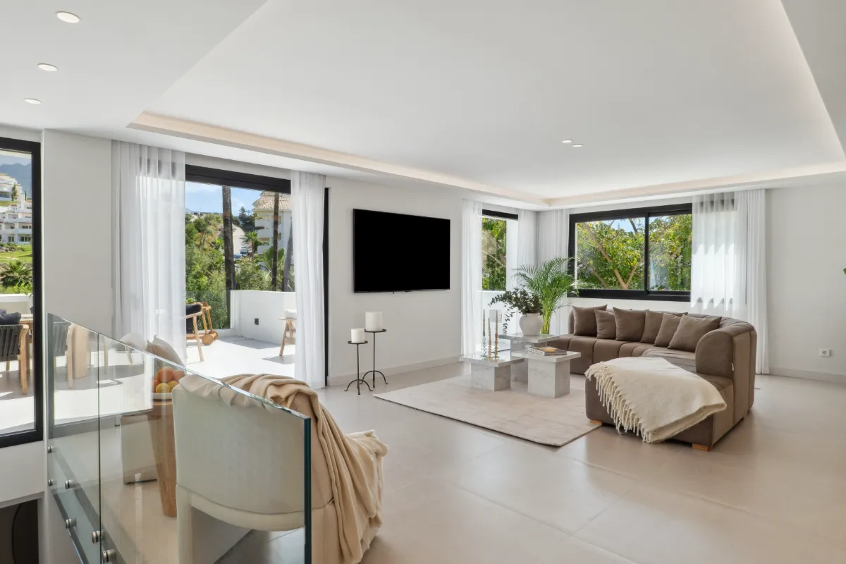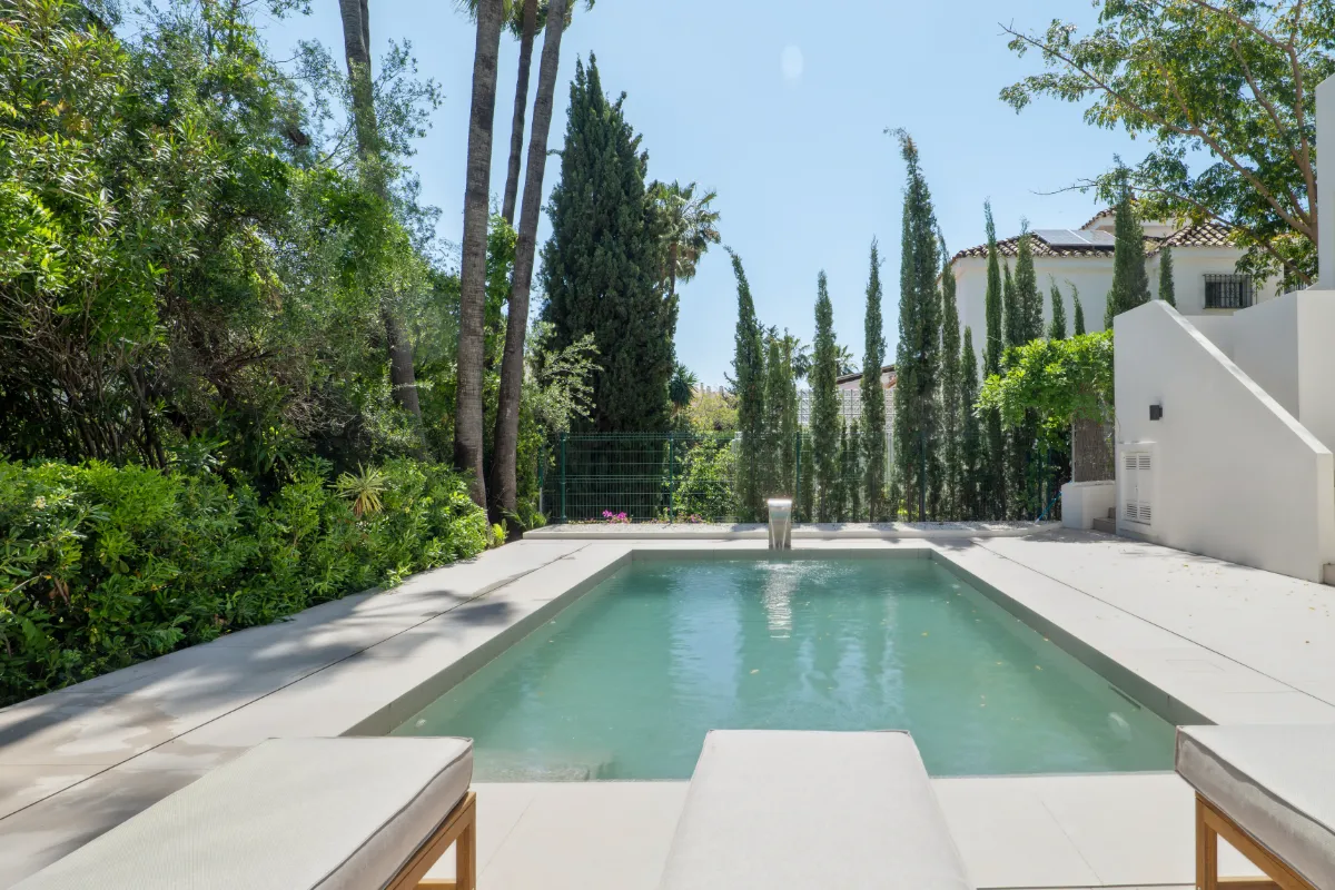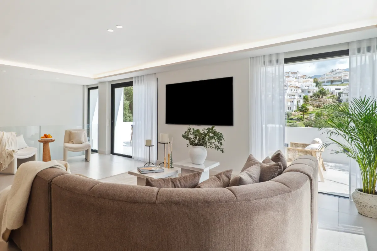 Outdoors, a generous pool and sunbathing deck create the perfect setting for long afternoons in the Marbella sun. The covered dining terrace is well suited for hosting under the stars. The villa is sold fully furnished, offering a turnkey opportunity for buyers who value both simplicity and style.