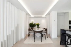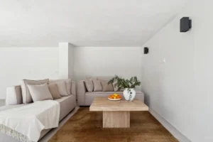 The villa is set on a 1,043 m² plot, with a built area of 304 m² spread across two levels. A warm, natural palette runs through the interiors, enhanced by natural light and views of the surrounding greenery. The expansive double living area is ideal for both quiet evenings and entertaining, while the open-plan layout ensures a seamless connection between inside and out.
