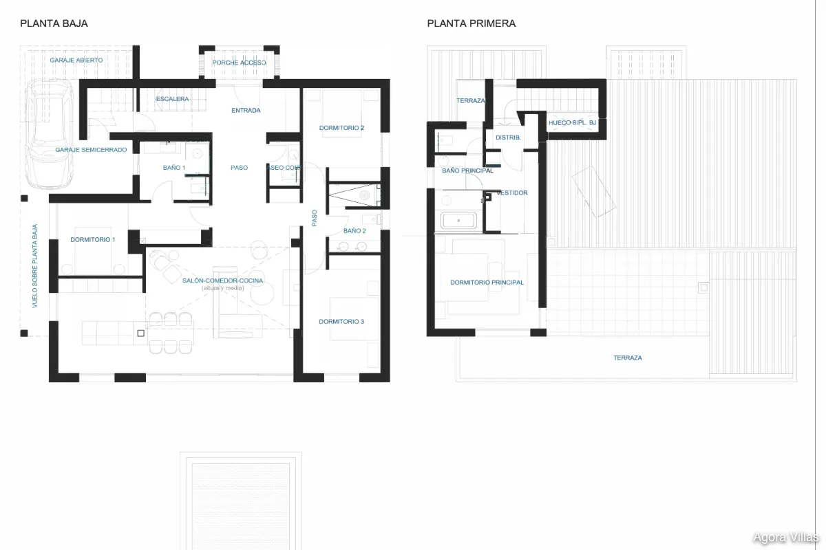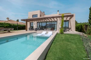 The villa spans 235 m² across two levels and sits on a private 864 m² plot. Inside, a spacious open-plan living area welcomes you with a fireplace and dining zone, flooded with natural light from floor-to-ceiling windows. The contemporary kitchen is designed for both beauty and practicality, while four generously sized bedrooms, including two en-suite, ensure ample space for residents and guests. Additional conveniences include a guest toilet and underfloor heating in the bathrooms.