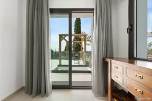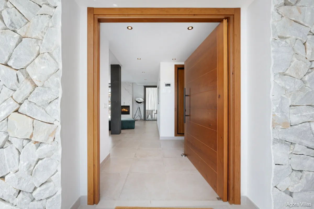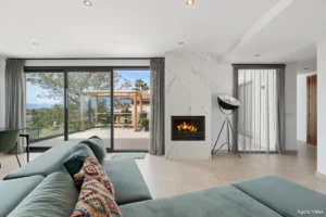 With 239 m² of built space on a 933 m² plot, the home is thoughtfully designed to accommodate both relaxation and entertaining. It includes four spacious bedrooms, three of which are en-suite, plus a guest toilet. The open-concept kitchen is fully equipped with high-end appliances, flowing into a bright living room centered around a contemporary fireplace. Floor-to-ceiling windows frame the views and flood the interiors with natural light.