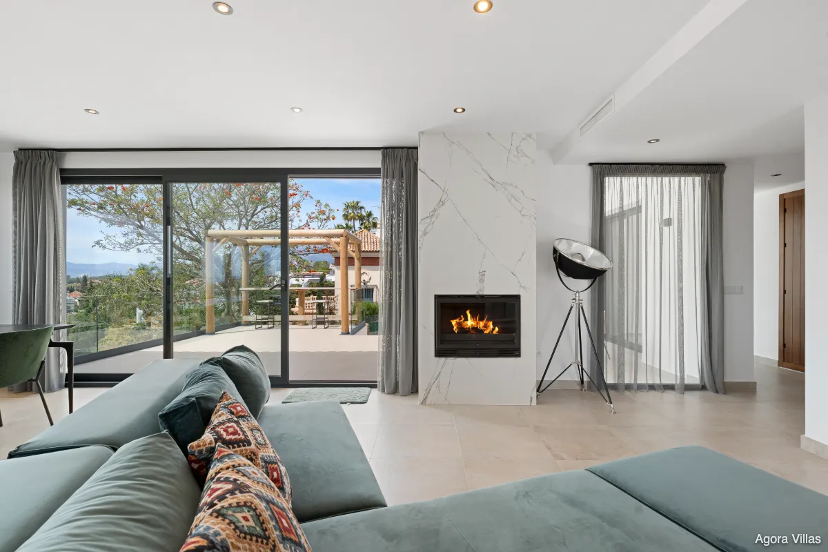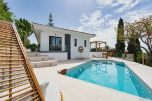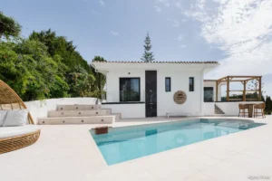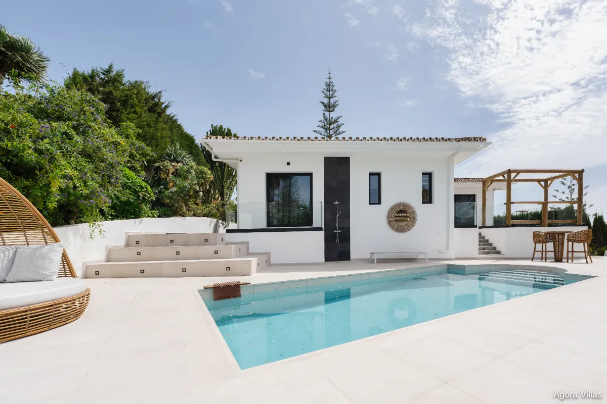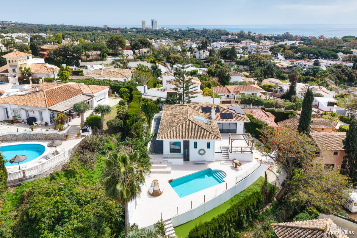 Positioned in the quiet hills of Elviria, Villa Sama offers panoramic sea and mountain views from one of Marbella East’s most prestigious residential areas. Recently renovated in 2024, this modern single-level villa combines elegance, privacy, and seamless indoor-outdoor living.