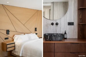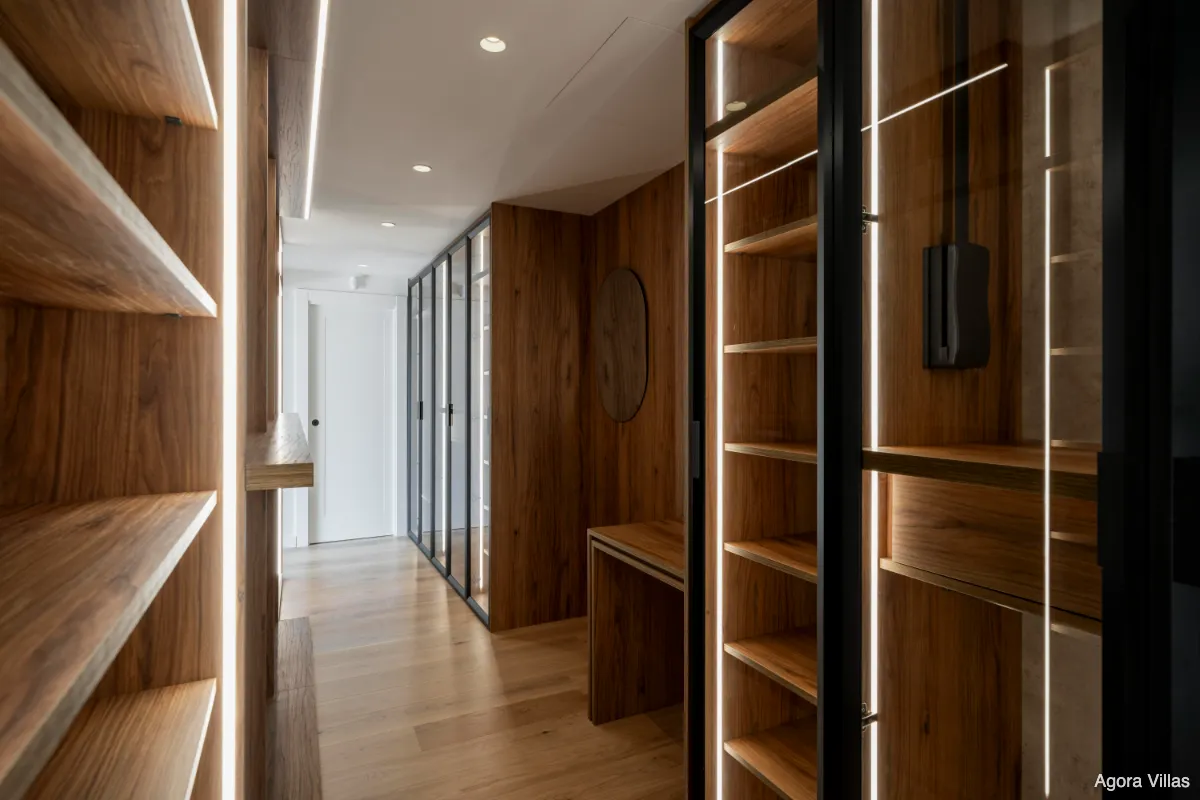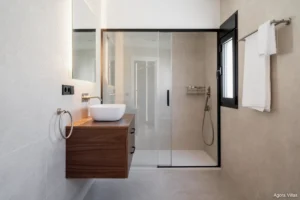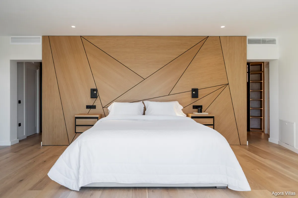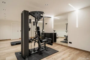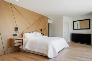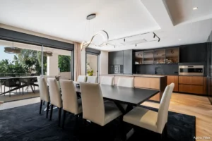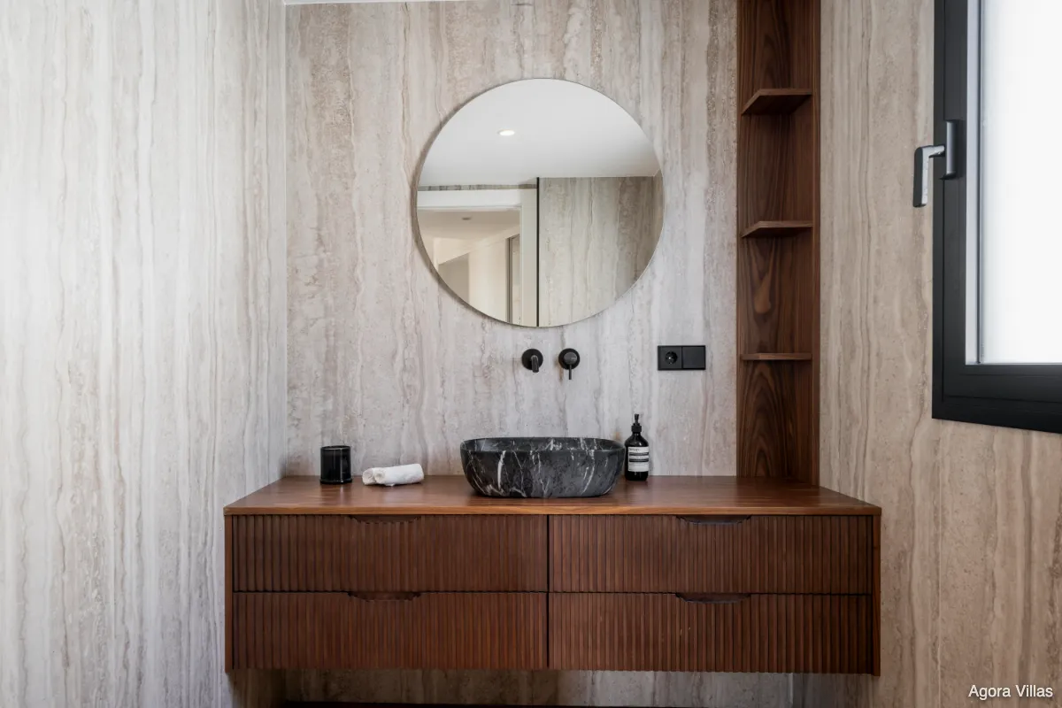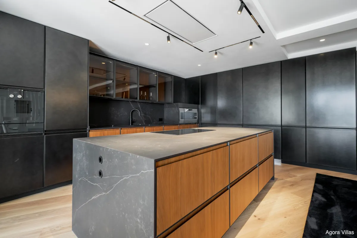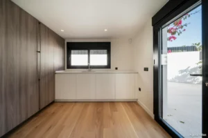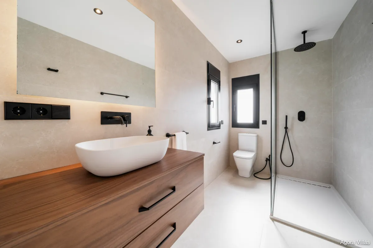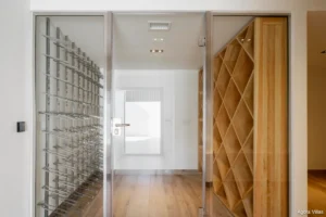 The upper floor is dedicated entirely to the master suite, a private sanctuary with dual bathrooms, a spacious glass-walled dressing area, and a sun-drenched terrace facing the Mediterranean. On the lower level, you’ll find a self-contained guest apartment with its own kitchen and bathroom—ideal for long-term guests or staff—as well as a fully equipped gym, wine cellar, and an additional bathroom.