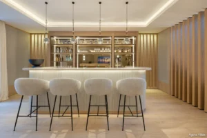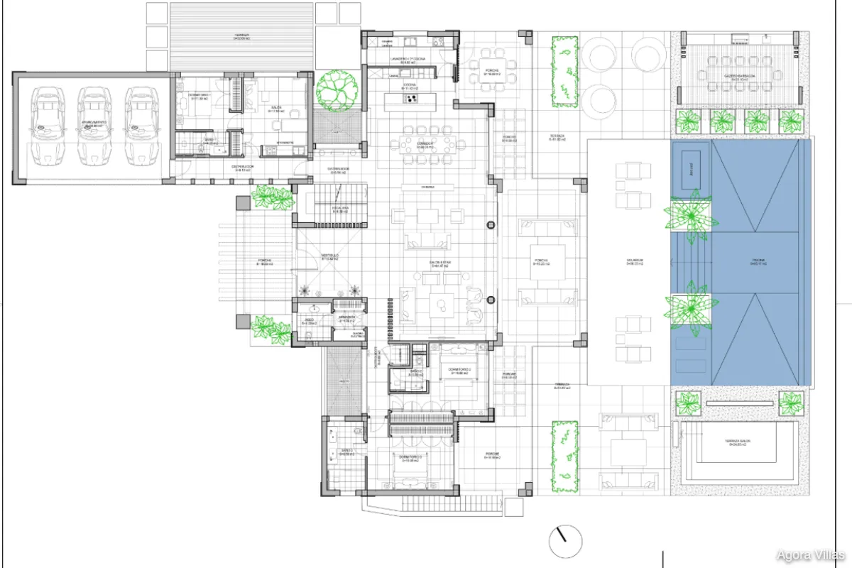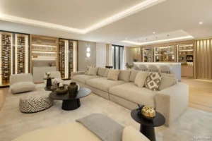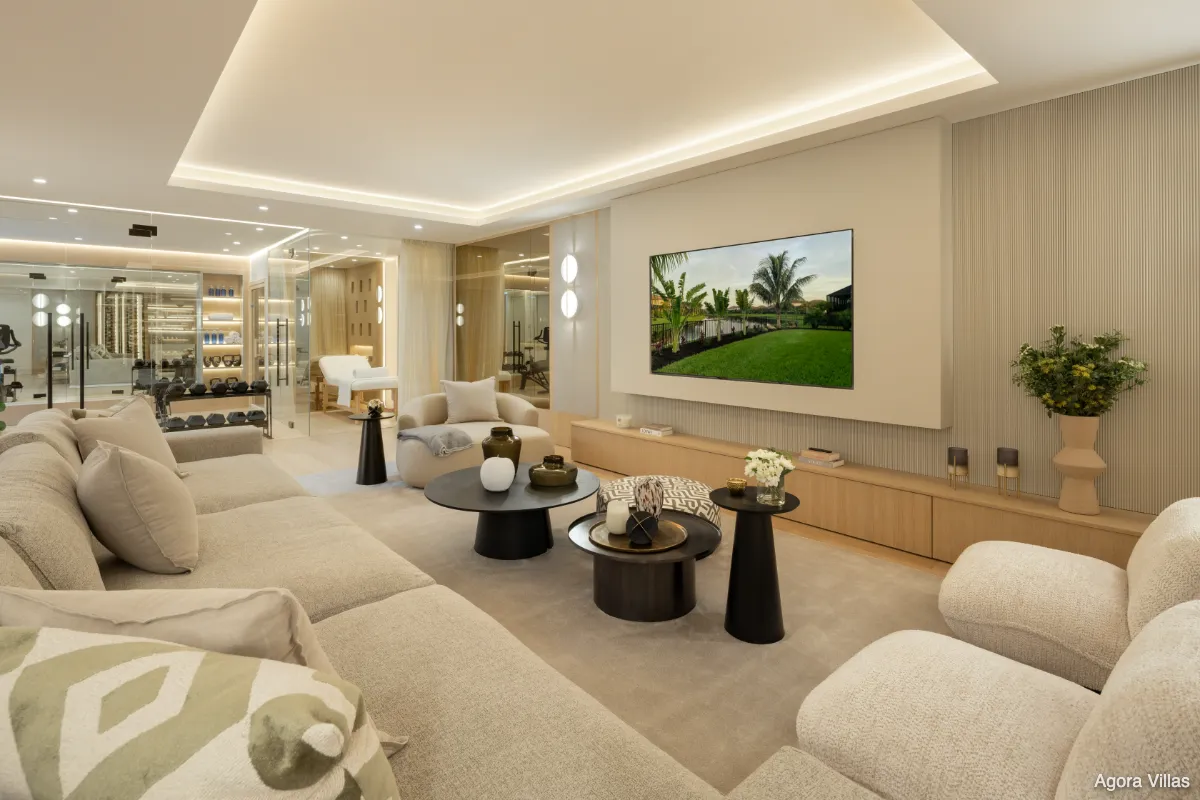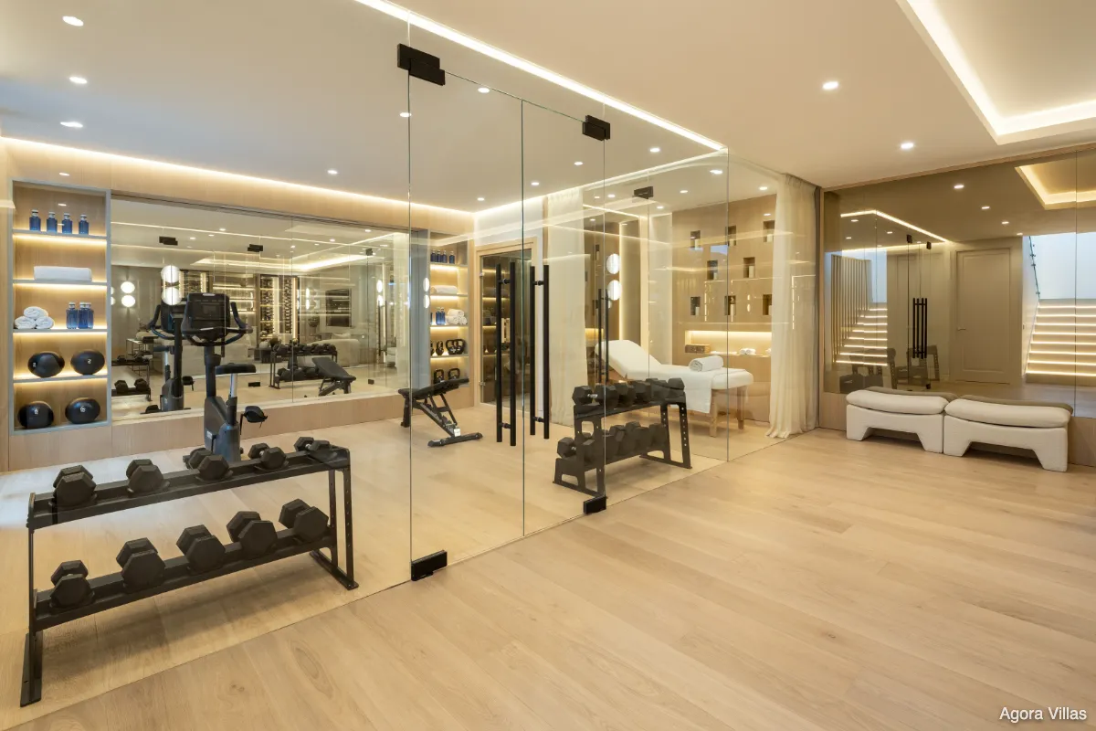 The lower level is a sanctuary of leisure and wellbeing, offering a fully equipped gym, a spa with sauna, a cinema and games room, a wine bodega, and a laundry area. A three-car garage with a low-entry system for sports cars, plus additional parking, completes this versatile estate.