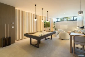 Entertainment and wellness are central to Villa Tiza’s lifestyle offering. A fully equipped gym, a wine cellar, a multifunctional room with bar, billiards table, and TV lounge, as well as an outdoor kitchen designed to catch the sunset, make it ideal for both everyday living and hosting.