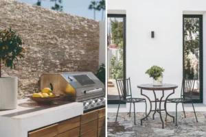 Set on a 1,126 m² plot, the 378 m² home unfolds across three levels. The main floor hosts a sunlit open-plan living space with a fireplace and floor-to-ceiling glass doors that lead to a covered terrace with an outdoor kitchen and pergola. From here, the heated pool, landscaped garden, and even a small basketball court create a dynamic setting for leisure and play.