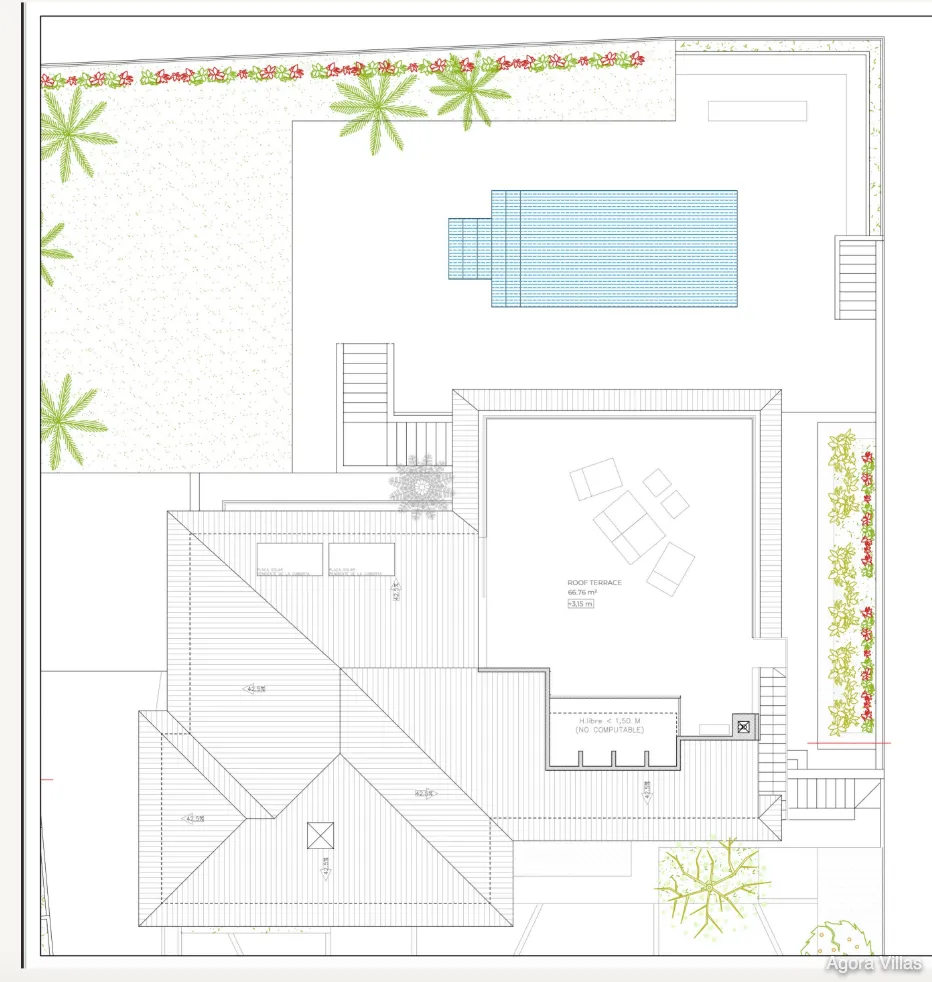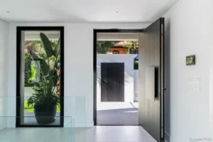 The outdoor living experience is elevated by a heated saltwater pool, lush tropical garden, and multiple terraces including a rooftop with panoramic sea views, an ethanol fireplace, and pre-installation for an outdoor kitchen. A flexible lower level allows for an additional living area, home gym, or guest space.
